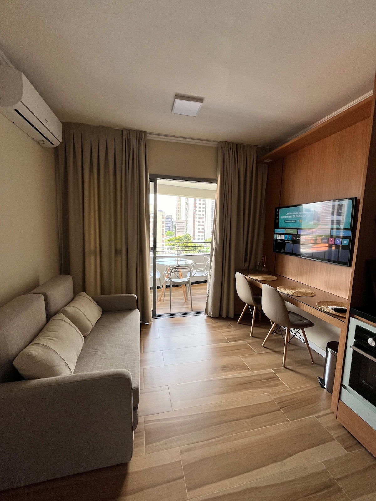 Experience One Eleven in Vila Olimpia. This modern apartment features large windows with breathtaking city views and natural light. The unit boasts 600 Mbps internet and a 4K HD TV. For total comfort, it has a Hot/Cold AC system: 27,000 BTU/h unit in the living room and 10,000 BTU/h in the bedroom. The bedroom is quiet and dark for a restful sleep. Impeccably maintained, you’ll be walking distance to top restaurants and business hubs—a safe, upscale retreat with a stunning urban backdrop.