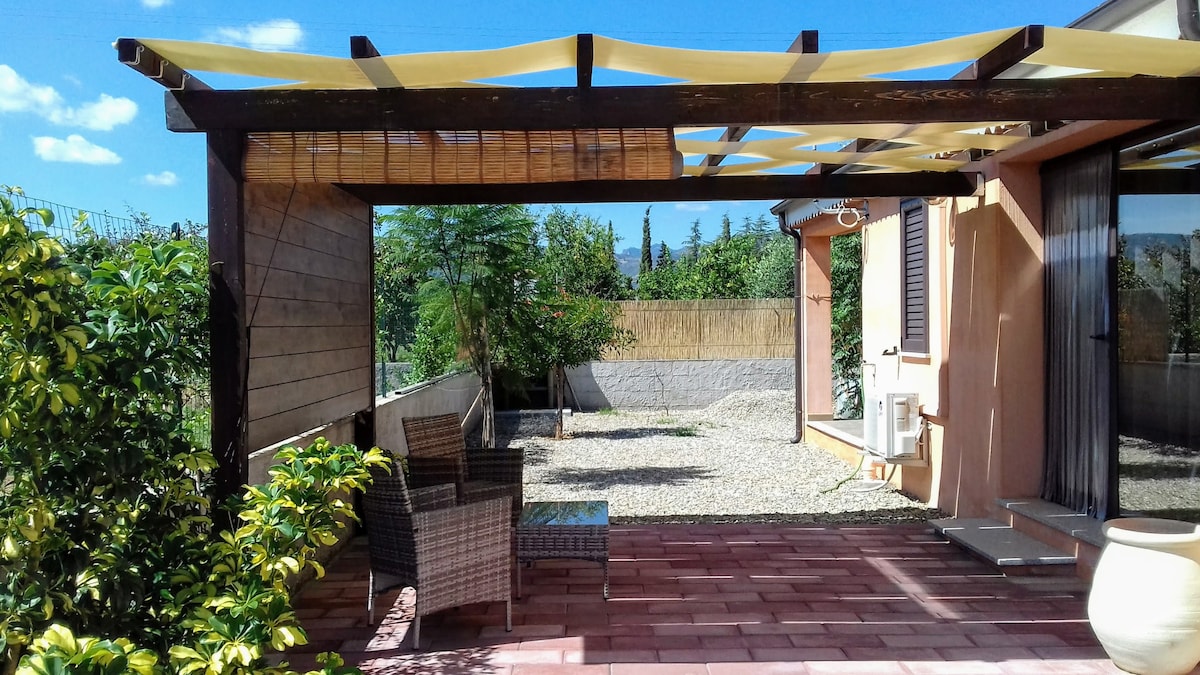 Ferienwohnung im Erdgeschoss mit separatem Zugang, großem Garten und überdachter Veranda. Vollständig möbliert, fein verarbeitet und mit allem Komfort ausgestattet. Bestehend aus Küche mit Wohnzimmer und Schlafsofa von einem Quadrat und einer Hälfte, Doppelzimmer, komplettes Badezimmer. Geeignet für 3/4 Personen. Ausstattung: Volle Küche, Geschirr, Backofen, Kühlschrank mit Gefrierfach, LCD-TV, WLAN, Klimaanlage, Parkplatz.
