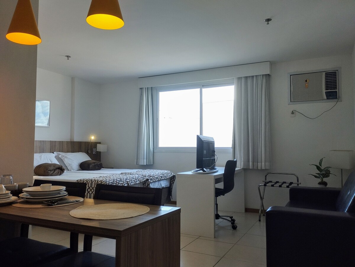 Flat completo no Edifício America Hotel & Residence, na melhor localização da cidade. Espaço com quarto, escritório, cozinha completa , banheiro e 1 vaga de garagem coberta. Inclui ar condicionado, TV por assinatura e Internet banda larga com wi-fi. Ideal para 2 ou 3 pessoas. O sofá cama de casal permite que durmam 4 pessoas confortavelmente. O condomínio tem estrutura completa com piscina, sauna, restaurante, academia, espaço kids e muito mais. Caso tenha interesse, também alugo mensal.