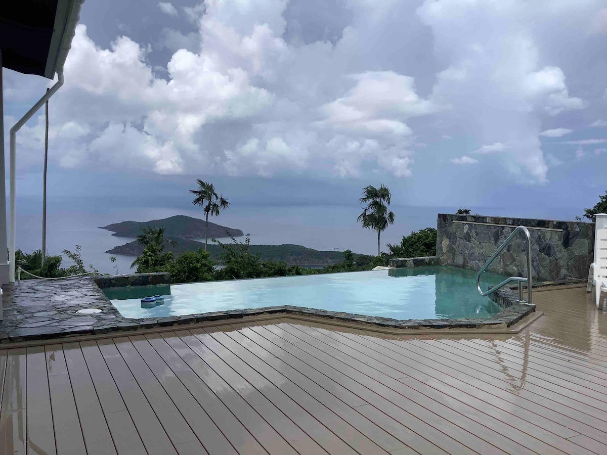 *NO CLEANING FEE* Located on the cool Northside of St. Thomas, our home looks out over a large flat-ish yard & a panoramic view of Magen's Bay, the Atlantic Ocean, and 20 small islands. Your unit has a private entrance 5 steps down from your dedicated parking space. Note: 1. There is no smoking allowed on the deck or in the apartment. 2. Unlike many Airbnbs we do NOT charge a cleaning fee so we ask our guests to sweep and wash their dishes before leaving. 3. No more than 4 guests at ANY time.