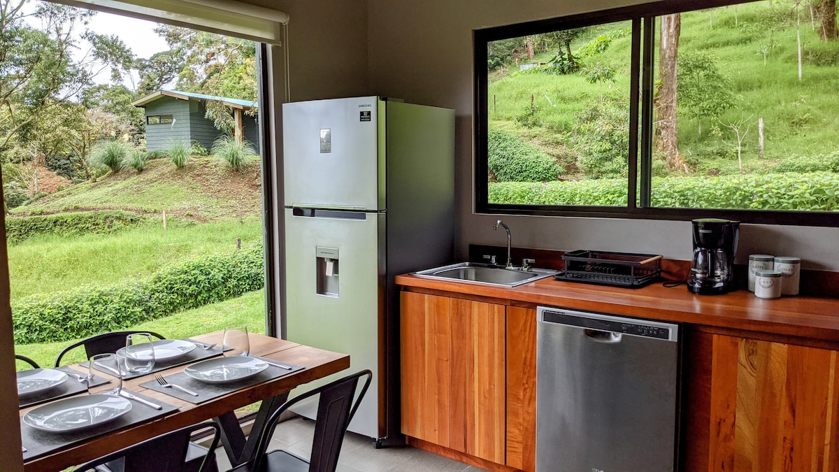 Willkommen in Tres Volcanes, einer luxuriösen Holz- und Glashütte auf einer 56 Hektar großen Ranch. Strategisch am höchsten Punkt des Grundstücks gebaut, von wo aus man die Vulkane Arenal, Tenorio und Rincón de la Vieja am Horizont sehen kann. Du kannst dich mit dem Geräusch des Flusses ausruhen, der am Fuß des Berges vorbeifließt, und aufwachen, um eine Tasse Kaffee zu trinken, während der Nebel durch die Baumkronen verschwindet. Gerade rechtzeitig, um zur Molkerei zu gehen und das Melken mit den Händen zu erleben und Eier zu sammeln.