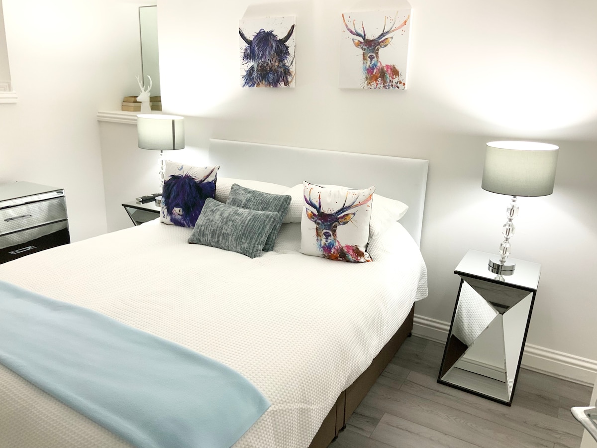 Gill Farm. Thorntonhall. Glasgow. - in der Nähe von Jackton, East Kilbride, Eaglesham, Newton Mearns, Clarkston, Busby 20 Minuten mit dem Auto ins Stadtzentrum. 2 Stationen - 5 Autominuten entfernt. Luxuriöses Privatzimmer mit eigenem Bad in einem umgebauten Bauernhaus. Es ist hell und hell mit eigenem Eingang und voll ausgestatteter Küche - Backofen, Herd, Wasserkocher, Toaster, Mikrowelle, Heißluftfritteuse und Kühlschrank/Gefrierschrank. Nur wenige Gehminuten vom lokalen Dorf Eaglesham mit einem schönen Pub entfernt, der hundefreundlich ist, mit gutem Essen, genannt Schwan.