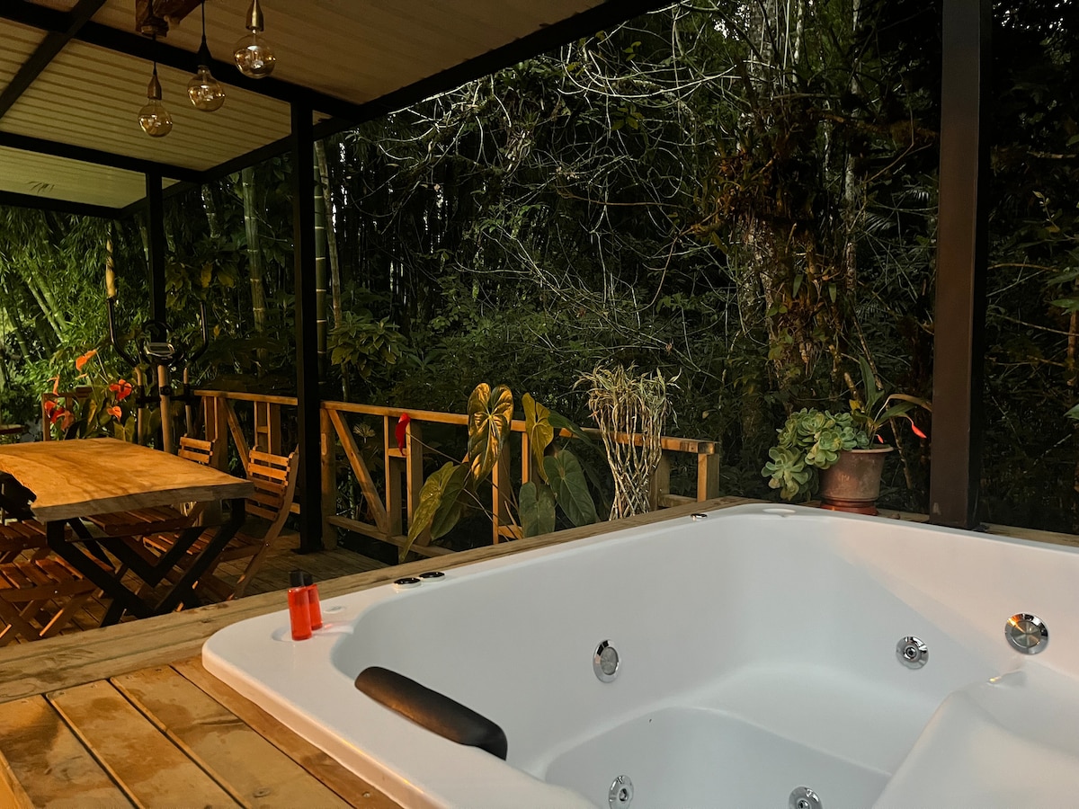 Trenne dich von der Routine in dieser einzigartigen und entspannenden Unterkunft, inmitten eines magischen einheimischen Waldes findest du einen luxuriösen Ort mit allem Komfort, Whirlpool mit Hydromassage, Blasen und unbegrenztem Licht, Katamaran-Netz, sehr gut ausgestattete Küche, Räucherfass oder Holzkohlegrill, Platz für privates Lagerfeuer. Ein spektakulärer Sonnenaufgang inmitten der Natur. Du wirst auch Platz haben, um um den See herum zu spazieren und in den Nächten leuchtet der Wald auf wunderbare Weise.