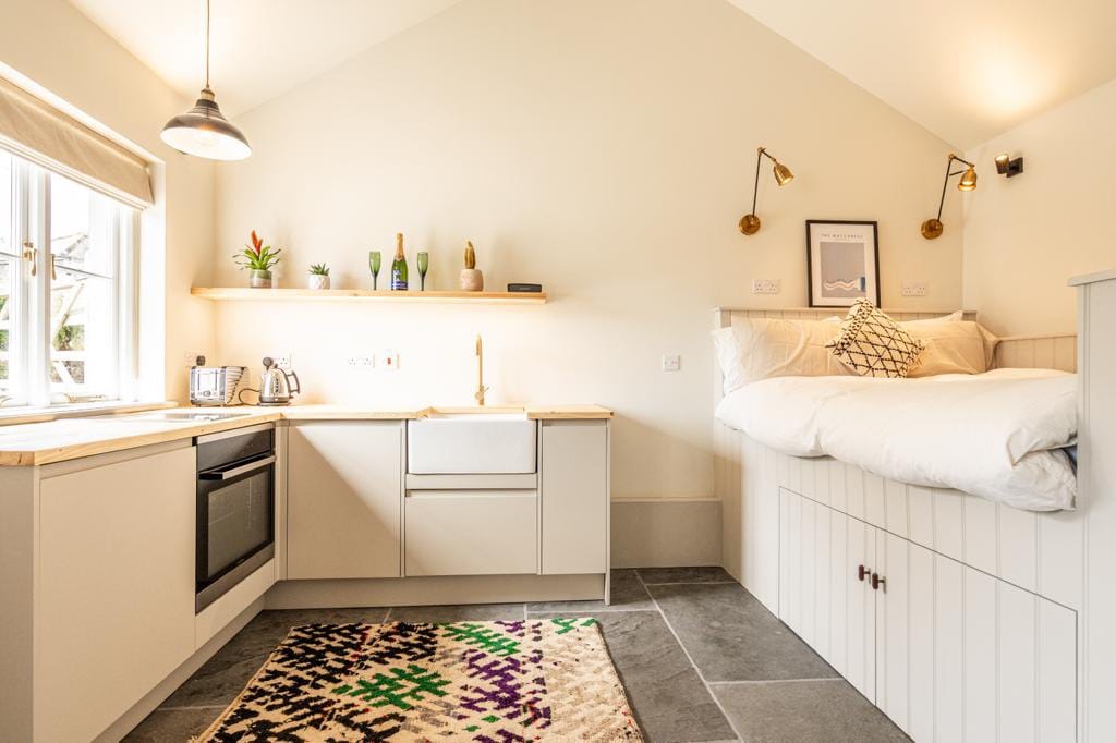 A modern, light, self-contained studio with open plan stairs to a small double low loft bed, in a mezzanine sleeping area, with sloping ceiling (partial height restriction). Private entrance to an open plan kitchen and lounge, with a shower room. This scandi-inspired space is suited to cosmopolitan travellers. Only 5 mins walk to Falmouth town centre, cafes, bars and restaurants and to Gyllyngvase beach, Dell train station and Falmouth University. Off road parking on shared driveway.