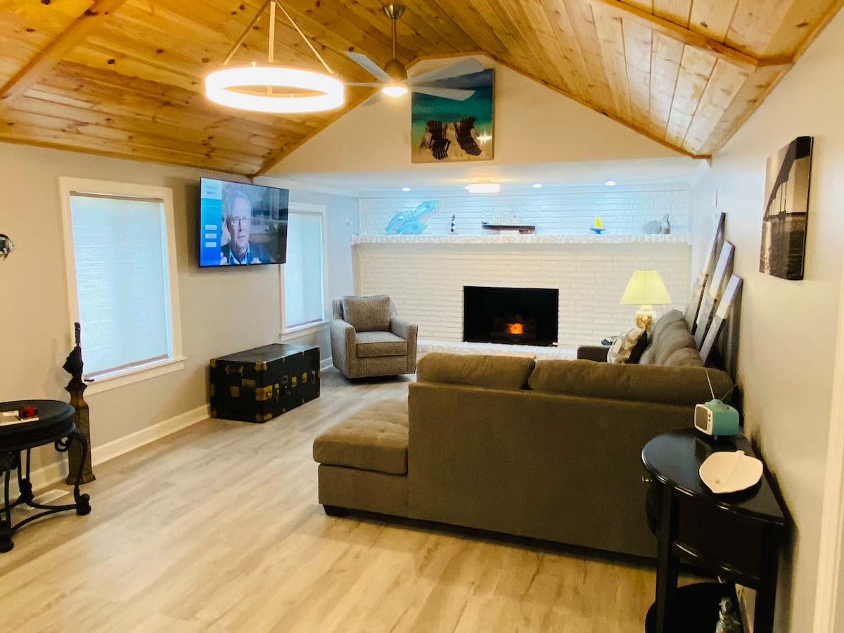 Entspanne dich mit der ganzen Familie auf der wunderschönen Harkers' Island. Lass deinen Alltag hinter dir, während du deinen morgendlichen Kaffee schlürfst und den Blick auf das Wasser und das Zwitschern der Vögel von der abgeschirmten Veranda aus genießt. Dieses Haus mit 3 Schlafzimmern und 2 Bädern wird sich wie dein ganz eigenes Refugium am Meer anfühlen. Dieses Haus ist wunderschön mit einem nautischen Thema und großen Panoramafenstern eingerichtet. Zu den Aktivitäten in der Nähe gehören das berühmte Angeln der Insel, Kajakfahren und die Fähre nach Shackleford Banks und Cape Lookout.