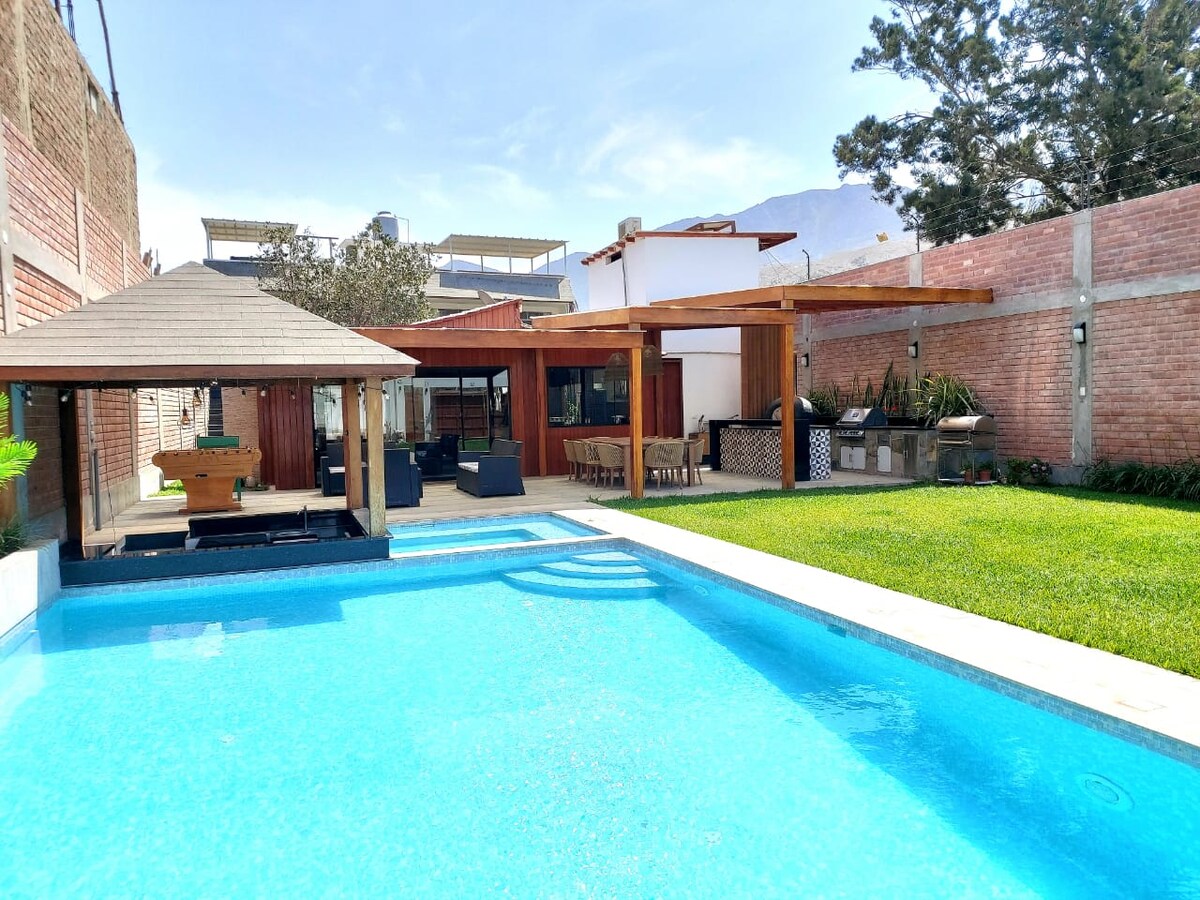 Casa ideal para disfrutar en familia y/o con amigos, con sol durante todo el año. Moderna y confortable casa de 2 pisos que cuenta con 5 habitaciones, TV por cable, 2 cocinas totalmente equipadas, 2 salas de entretenimiento, equipo de sonido, piscina, juego de sapo, mesa de tenis de mesa, caja china-parrilla, wifi y 3 estacionamientos. No se aceptan mascotas.