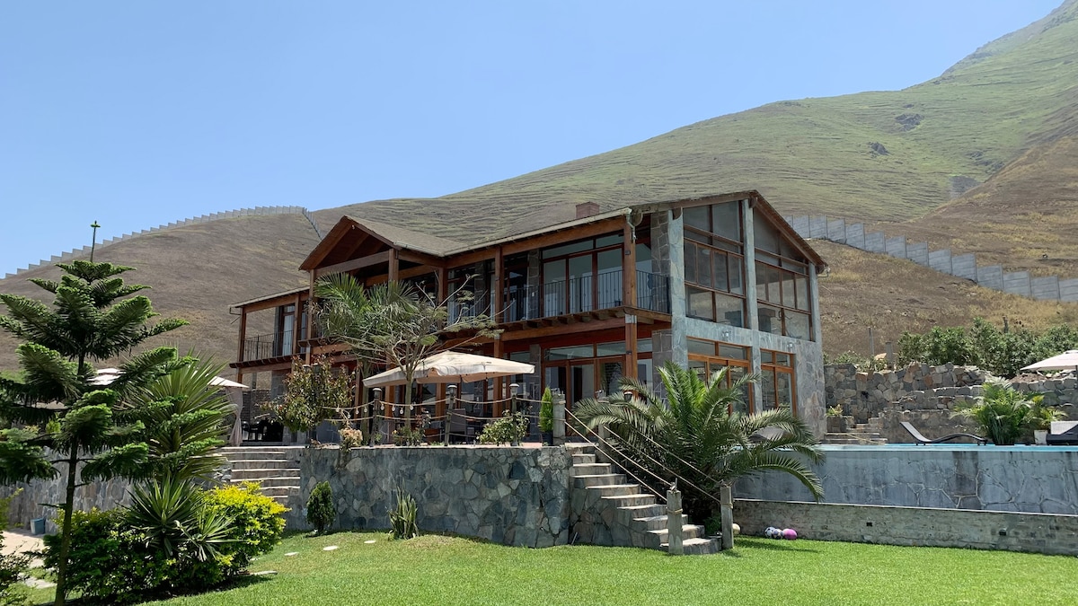 ❤️ Hermosa casa de campo, a con una bella vista a las montañas y al valle de Cieneguilla. Refréscate en la gran piscina de 8.5 metros, descansa en las perezosas, en las tumbonas o por qué no en el césped fresco bajo un árbol de ese amplio jardín, donde encontrarás sol todo el año. El jardín cuenta con áreas sociales y de relajo. Cuenta con una moderna cocina de chef. En la sala se puede ver una doble altura con ventanas gigantes. En la noche podrás prender la chimenea acompañado de un buen vino.