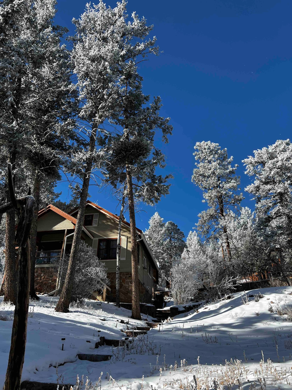 Gorgeous in every season, this 2 bedroom, 2 bath historic cabin backs to wilderness. Enjoy amazing views of the surrounding trees and rocks. Located on Pikes Peak, Hidden Falls cabin is just 10 minutes from Manitou and Colorado Springs but it feels like a world away. Take in the views from your soak in the hot tub or under the outdoor shower. Walk to the Wines of Colorado for libations and food. The cabin is an ideal destination for a restful retreat, a romantic getaway, and adventure basecamp.