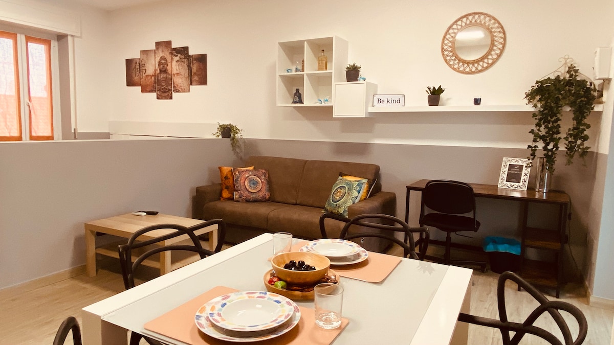 Monolocale completamente ristrituttarato composto da : zona living con tv e divano letto matrimoniale, zona notte con letto matrimoniale, bagno privato con doccia e lavatrice, zona pranzo con cucina atrezzata, bollitore, macchina del caffè, frigorifero, wifi gratuito, cassaforte Posto al piano terra con ingresso indipendente e cortile interno, posto auto. NB: dal 1° Aprile 2025 il Comune ha emesso la tassa di soggiorno di 2 euro a notte per persona da pagare in struttura in contanti .