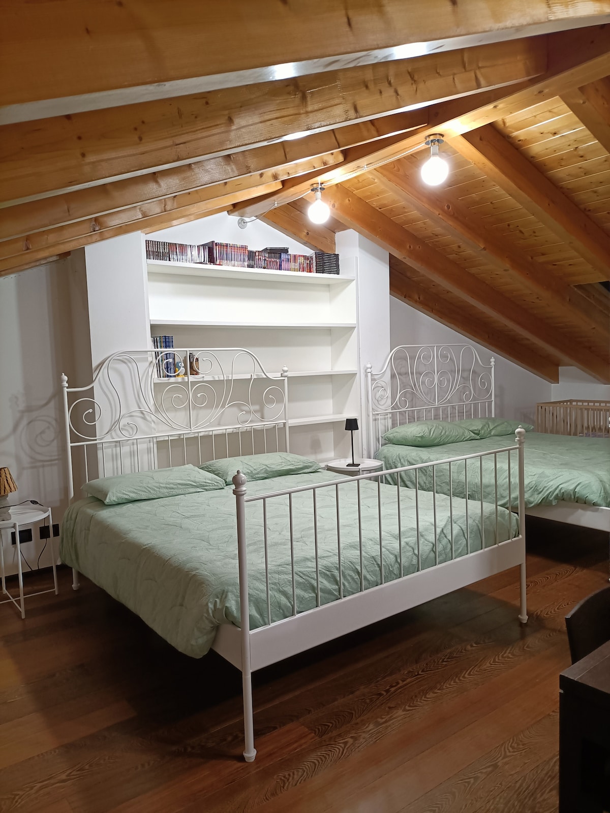 The Guest Suite is an intimate attic with parquet floors and exposed sloping beams that create a warm and cozy atmosphere. The bathroom, with a double shower and suspended sanitary fixtures, offers high-quality comfort and design. Air conditioning and heating ensure a pleasant stay in any season. The parking under the house is spacious, public, and free. Thanks to the nearby highway, Malpensa Airport and the cities of Como and Milan can be reached in just 30 minutes.