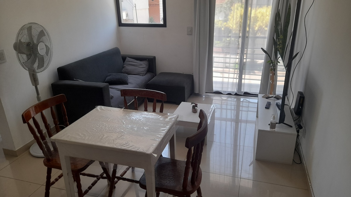 Departamento en primer piso por escalera. Posee 2 dormitorios, el principal con 1 cama de 2 plazas y aire acondicionado, el secundario con 2 camas de una plaza. Posee Wifi/TV, terraza con galeria, parrilla y cochera interna techada. En vehículo a menos de 10 minutos al Colegio Militar de la Nación, Brigada Aérea El Palomar, Hospital Posadas, Hospital de Haedo, Club SITAS, Club AFALP, Universidad UTN Haedo, Parque industrial La Cantábrica, Planta Ternium/Siderar Haedo, Parque industrial Moron.