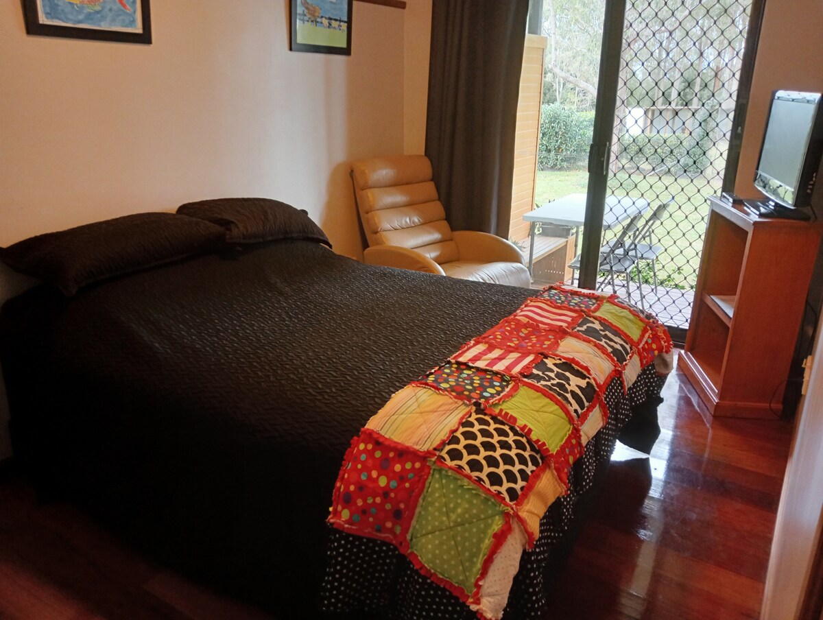The first thing you hear is the birds as the morning light streams through your windows or the block-out curtains allow you to rest as the day drifts by. Overlooking the pool and private yard surrounded by trees, it's hard to believe that Coles, Aldi, Woolworths, the train station, pubs & clubs are less than 2 km's away Our mild winters, exceptional beaches, National parks, & unique community are within reach daily! Visit for a day and stay a lifetime. Full Kitchen facilities, WiFi, AC, fridge.
