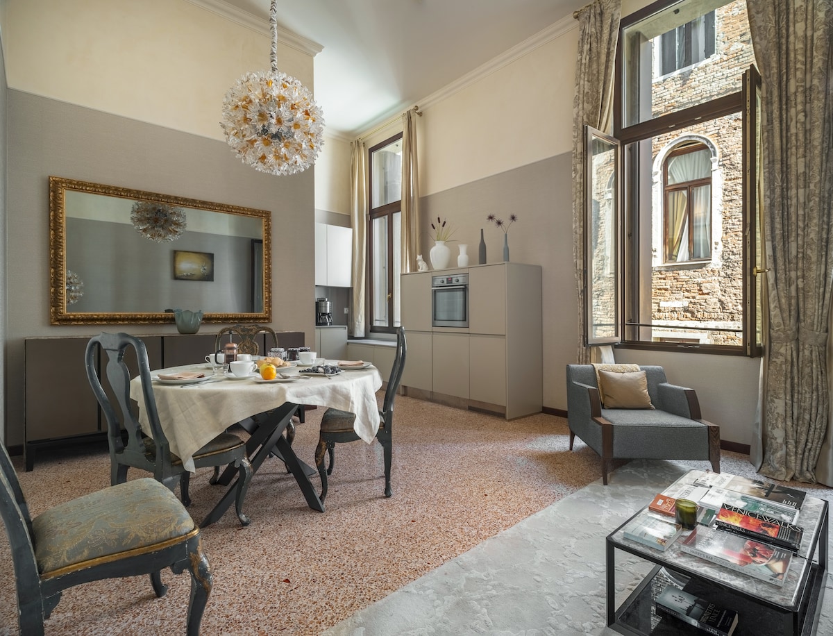 Panoramic views of Grande Canal await on the Venetian marble balcony of this Gothic apartment in Venice. Watch as gondolas and luxury yachts navigate the waters below while you sip Nespresso at the bistro table. Discuss the day’s sightseeing agenda over croissants at the fully-equipped kitchen’s breakfast table. Then, call a water taxi to meet at your private dock and set out to explore Venice. Copyright © Luxury Retreats. All rights reserved.