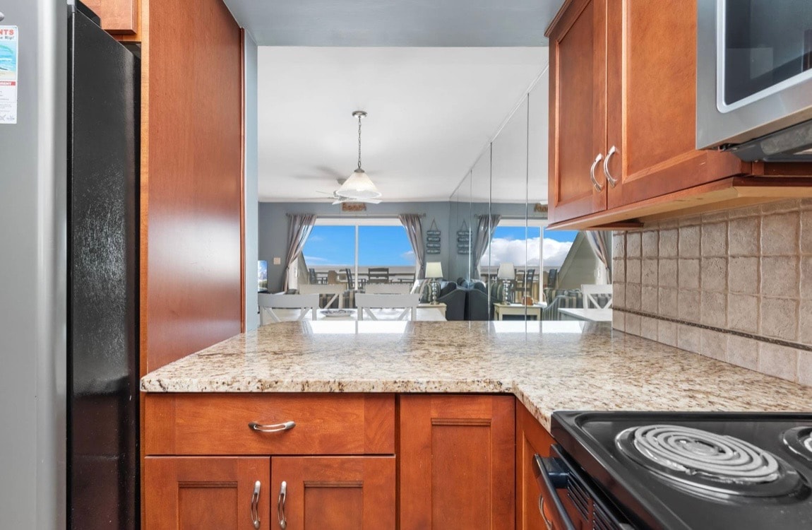 This spectacular ocean view condo with top notch renovations is just steps from the beach. Be swept away by the view of the rolling waves, whitecaps, and the OKI Pier as you relax and enjoy a beverage on the balcony. You will also be treated to a breathtaking sunset as the colors change each minute across the sky. Retire to the living room and rest your tired feet on a comfy sectional sofa as you interact with others in an aesthetically pleasing open floorplan setting.