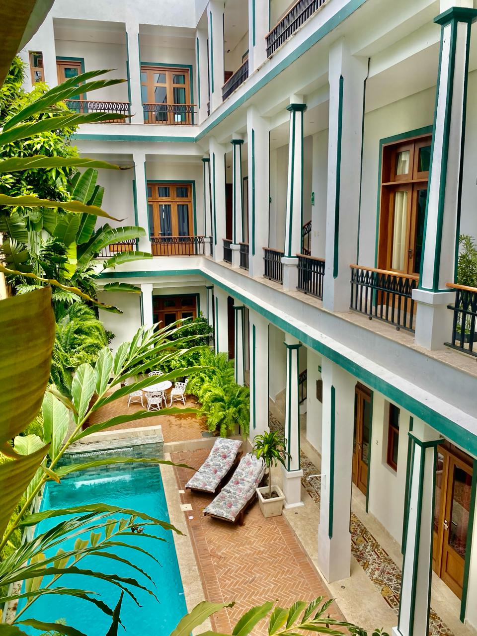 Bereite deinen Morgen-Espresso in einer hellen Küche im Kolonialstil mit freiliegenden Ziegelbögen und Vintage-Kobalt-Fliesenböden zu. Schwinge in einem Hängestuhl auf einer Dachterrasse mit spektakulärem Blick auf das historische Viertel und kühle dich dann im Tauchbecken eines üppigen, völlig privaten Innenhofs ab.
