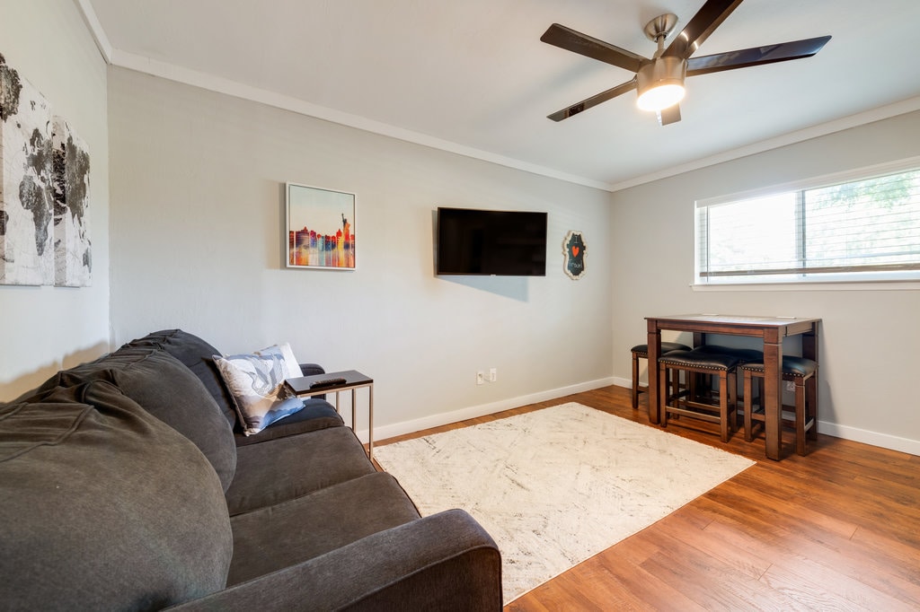 8 mins Drive to Domain. Smart, comfortably 3B2B home features beautiful new modern furniture, , 65" and 55" smart TV, blue tooth speaker built in ceiling fan, king size bed, walk in shower with rain shower head, smart décor with built in USB chargers, , a gorgeous covered patio, high speed google Fi WiFi, working desks with 24" monitor. The perfect place for families w/ kids or business people looking for the perfect home away from home.