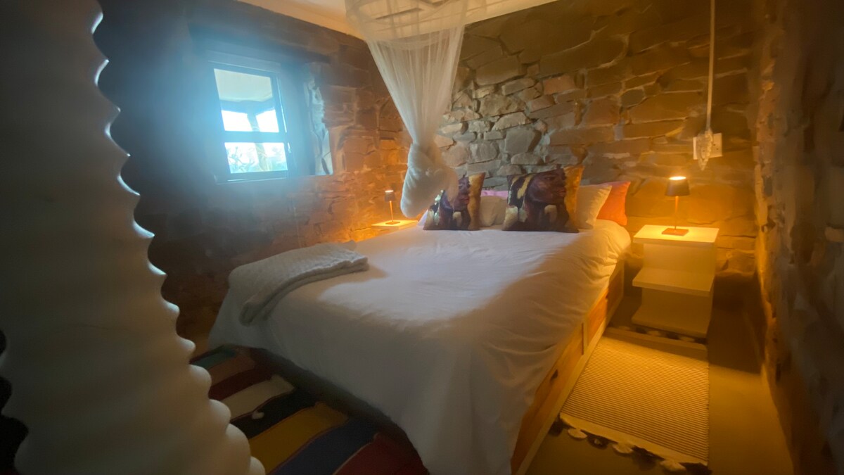 Ein-Zimmer-Ferienhaus, sehr privates, romantisches Ferienhaus mit Kingsize-Bett und offenem Kamin. Viktorianische Badewanne für zwei, exotische Außendusche. Voll ausgestattete Küche mit Kühlschrank, Braai und Gasherd. Ein elegantes Wohnzimmer mit offenem Kamin. Französische Türen öffnen sich auf eine schattige Veranda mit einem Braai-Platz. Ein tiefes Tauchbecken führt von der Veranda weg und bietet einige der schönsten Aussichten, die wir bieten können. Das Ferienhaus wird nicht gewartet und wir werden unser Bestes tun, um dich überhaupt nicht zu stören.