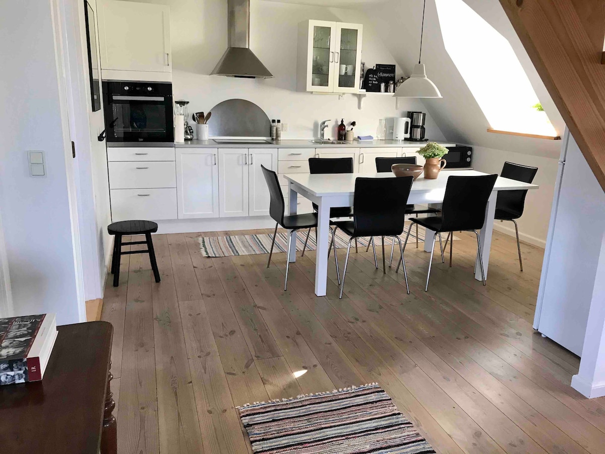 Insgesamt renovierte Ferienwohnung von 130 m2 befindet sich im Dorf Kvols, die von Hjarbæk Fjord befindet. Die Wohnung befindet sich im ersten Stock des alten Heubodens eines ehemaligen Bauernhauses. Im Jahr 2012 wurde alles ersetzt und renoviert, nur die sichtbaren Deckenbalken bleiben erhalten. Von der Wohnung aus genießen Sie eine herrliche Aussicht. Die Reinigung liegt in der Verantwortung des Mieters, diese kann erworben werden.