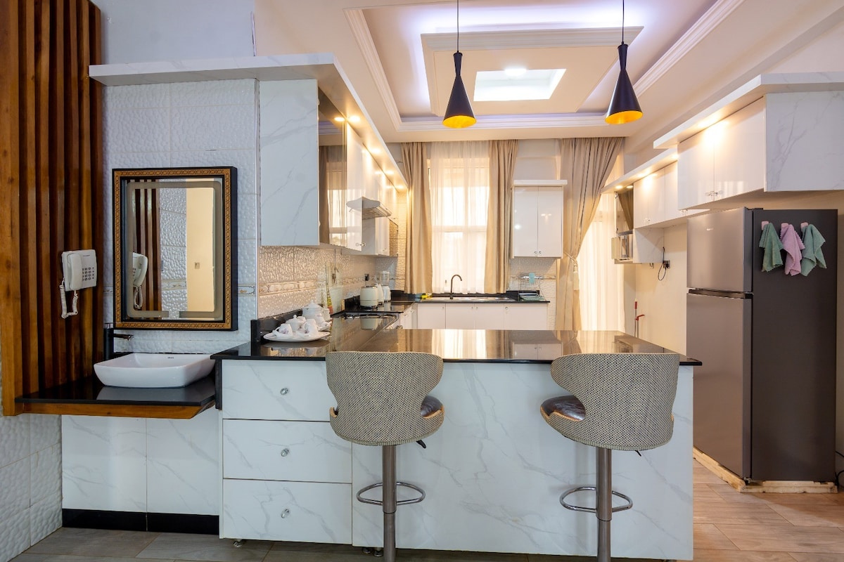 Residence 42 offers 5-star hotel-grade living in a spacious 4-bedroom home, ideal for families, groups, relocations, and business travellers. Set within a secure gated community with gardens and quiet streets, it provides international-standard comfort and privacy, while remaining close to the vibrance of city life. Enjoy European appliances, internet access, reliable 100% solar-supported power, stylish interiors, and generous space to live and work.