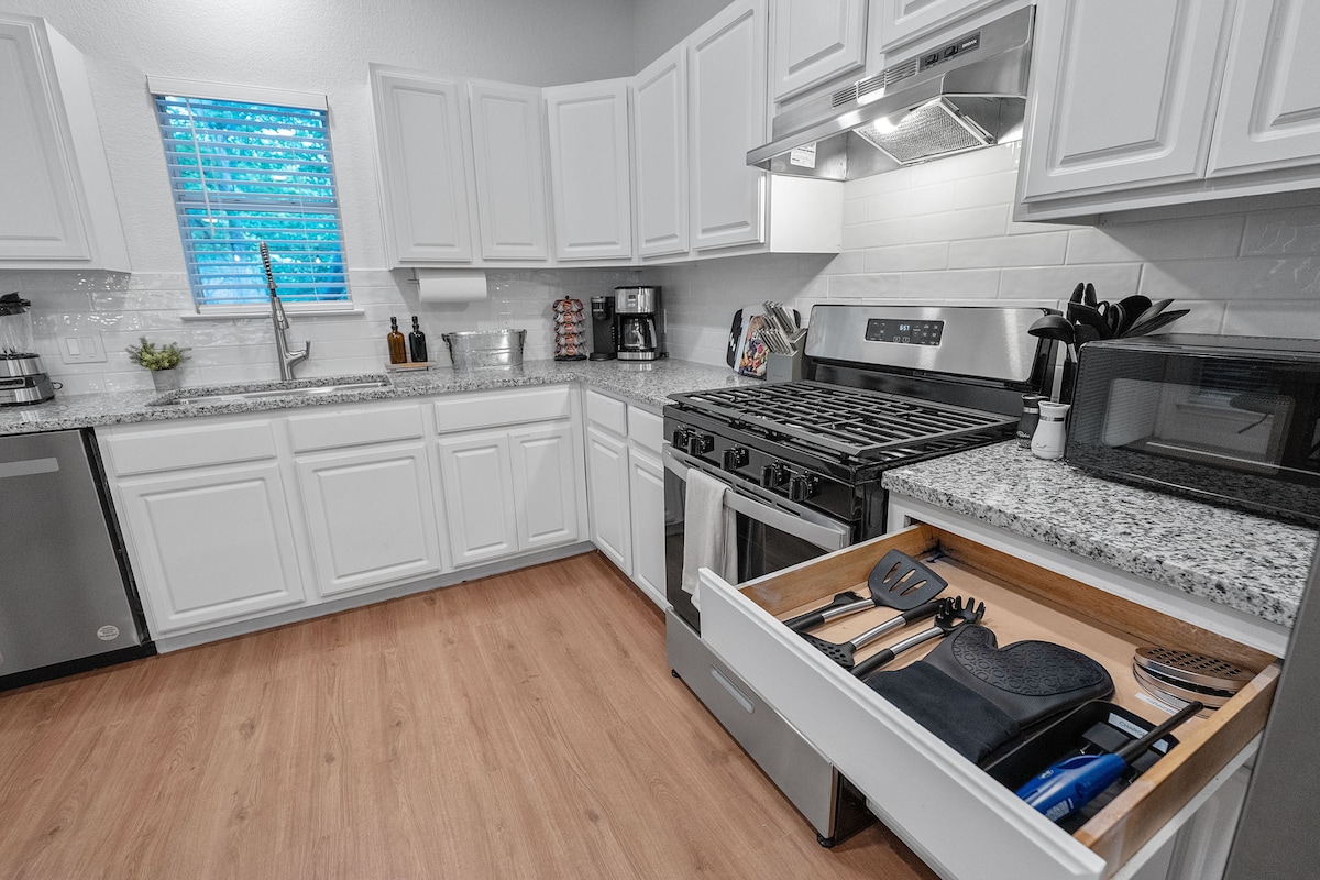 Im Herzen des Silo District liegt dieses neue Luxushaus in der Nähe von allem, was Downtown Waco zu bieten hat. Das Wishing House wurde als Zufluchtsort der Entspannung und gemeinsamen Erinnerungen geschaffen. Es ist ein modernes Haus mit hochwertigen Ausstattungsmerkmalen, die 2 Hauptschlafzimmer-Suiten, fantastische Wohnbereiche im Freien mit einer Outdoor-Filmwand, Feuerstelle, Grill und einen Balkon mit Blick auf die Innenstadt von Waco umfassen. Dieses Haus bietet eine schöne Küche für einen Koch und ein Wandgemälde, das von einem Künstler entworfen wurde, der im Fernsehen zu sehen war.