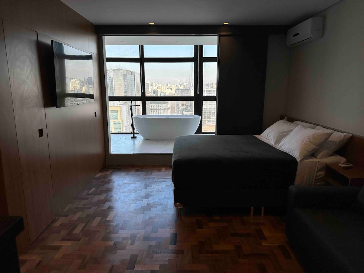 Estúdio espaçoso com muito design, arquitetura e a melhor vista de São Paulo. Loft completo! Com cama queen, closet, ar condicionado silencioso, cozinha completa, home office, WI-FI, TV 55” e uma belíssima banheira de imersão, de onde pode apreciar o seu drink preferido e curtir uma vista apaixonante. São Paulo toda estará há poucos minutos de você. Acesse o metrô andando apenas 200m. Reserve com tranquilidade! Proporcionaremos uma excelente hospedagem e uma ótima experiência!