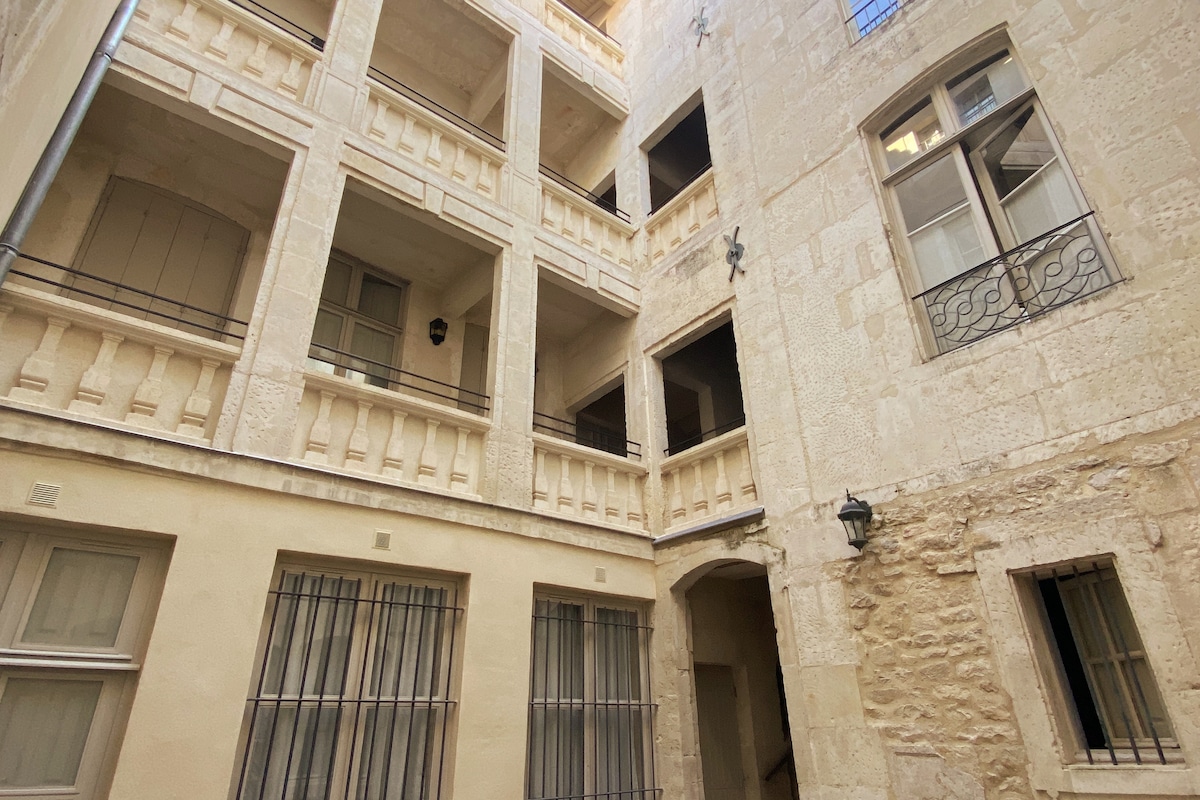 Bel appartement refait à neuf et très bien équipé au deuxième étage d'un immeuble de caractère. Ce logement calme et chaleureux est idéalement situé dans le centre historique de la ville de Nîmes, à 3mns à pied des Arènes et de la Maison Carrée ainsi qu'à moins de dix minutes de la gare de Nîmes centre. Le bâtiment du XVIIe siècle se situe au coeur de l'Ecusson, au pied des restaurants et des commerces. Vous pourrez notamment effectuer aux Halles de Nîmes une balade gourmande et authentique.