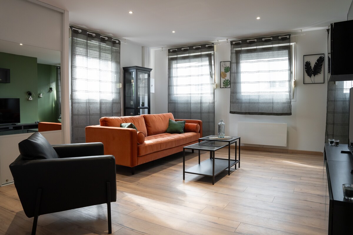 Experience luxury in Reims. Set in a 19th-century private mansion, this air-conditioned designer Duplex blends historic charm with modern comfort. The highlight? Your own private SPA (Sauna & Hammam) to relax after sightseeing. Perfectly located in the Golden Triangle (steps from Place du Forum & Cathedral), it features 2 independent bedrooms and high-end amenities. Sleeps up to 6 guests.