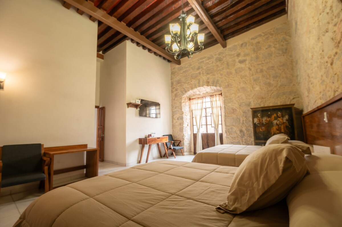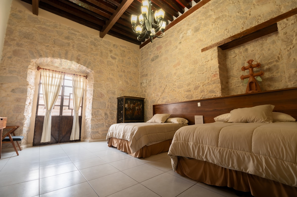 Amplio espacio tipo Loft en Casona Origen Habitación de dos pisos en la que encontraras comedor y sala en la planta baja. Una cama matrimonial, litera con colchón queen size y dos individuales. Cuenta con BAÑO PRIVADO FUERA de la habitación, a escasos 10 pasos. Tv, Wifi, Secadora, Toallas, amenidades baño. El espacio no cuenta con estacionamiento propio. Se tiene convenio con el estacionamiento mas cercano a la Casona.