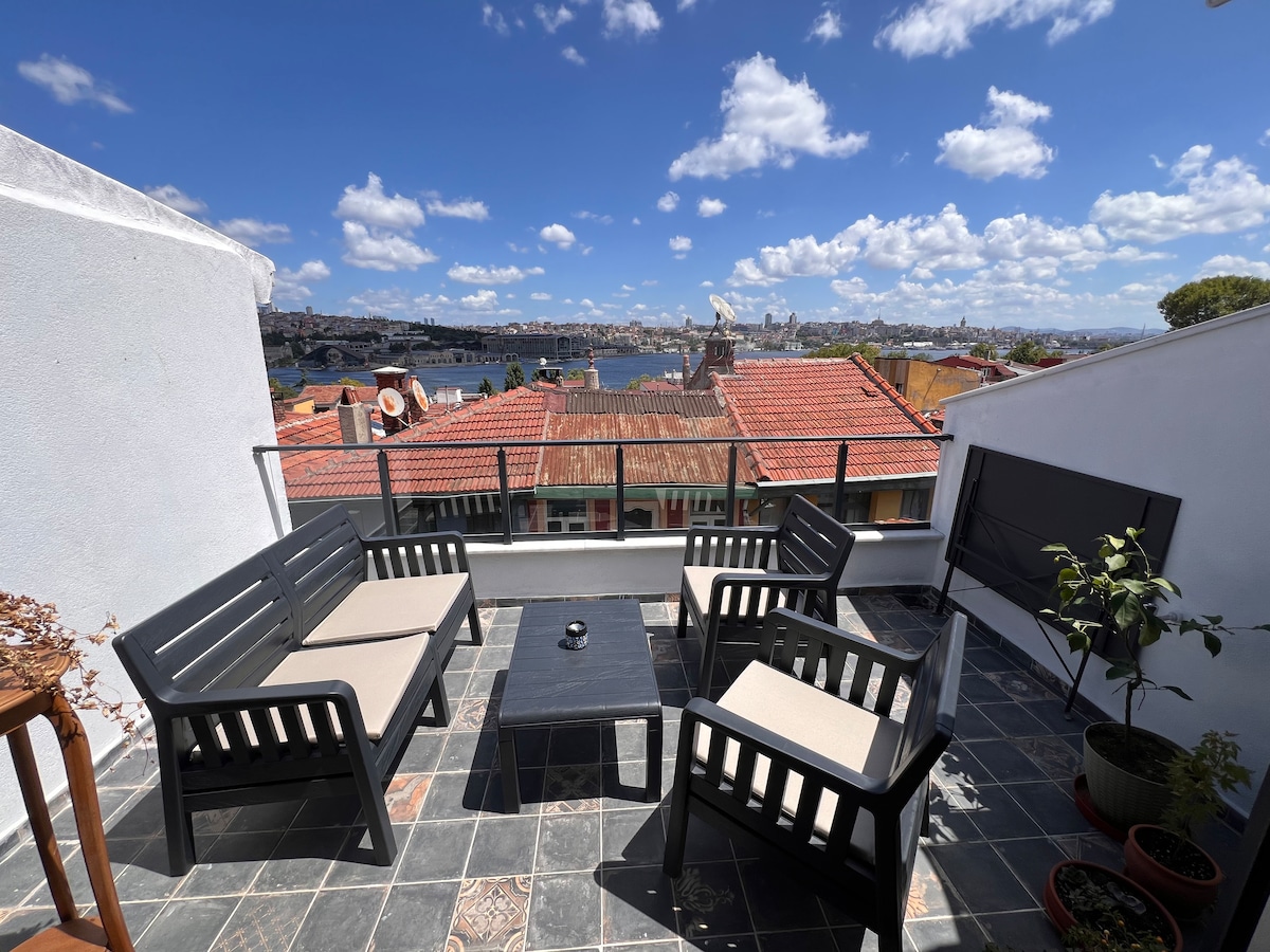 This stylish, well-decorated (all wooden furniture is handmade), spotlessly clean, large, and unique suite has a high-quality bathroom and elevator in the great location in the Beyoğlu/Taksim district. Moreover, the magnificent panoramic view of Bosphorus (till Prince' Islands and Asian side) and Historical Peninsula (Topkapi Palace, Hagia Sophia, Süleymaniye Mosque, Galata Tower, along with other famous monuments) can be seen from its private balcony.