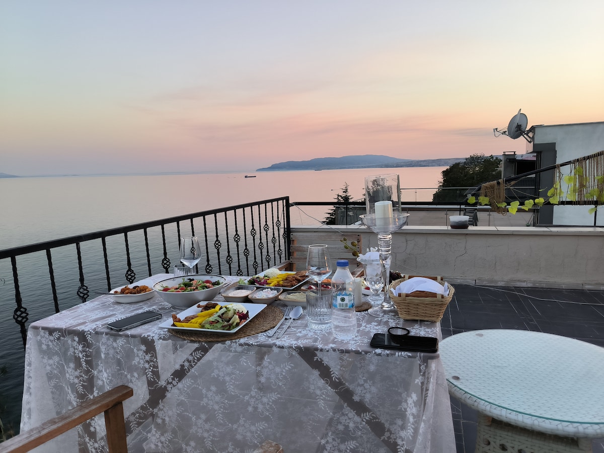 %100 deniz manzaralı, şömineli 1+1 teras katı