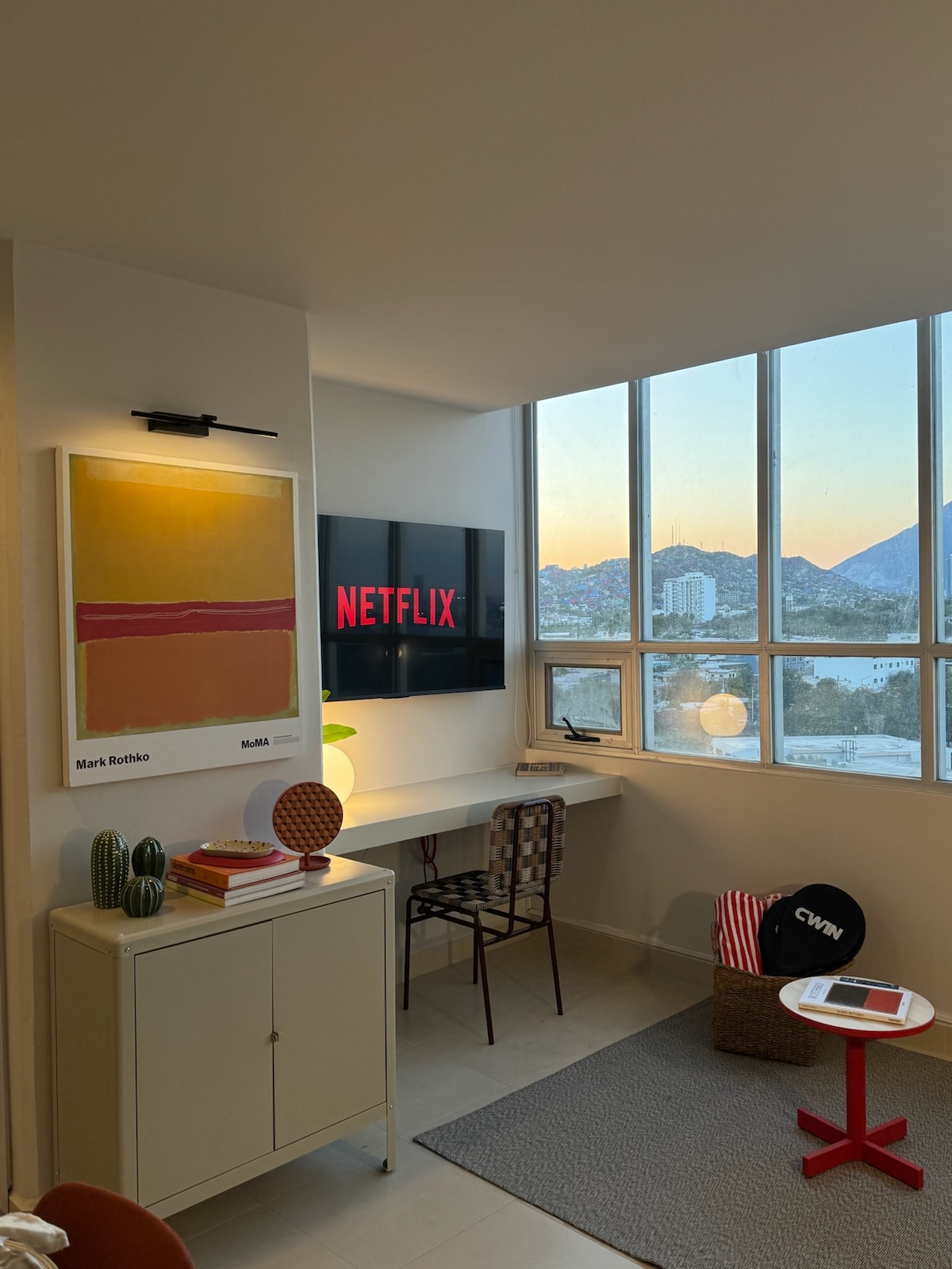 Hermoso, moderno y lujoso departamento ubicado en las faldas del Cerro de la Silla. Espectaculares vistas panorámicas a la ciudad y las montañas. Colonia privada y 100% segura, cerca de las zonas comerciales y principales restaurantes y avenidas de la ciudad, a 15 minutos del centro de Monterrey, de Parque Fundidora, de San Pedro y de Santiago. Mobiliario 100% nuevo, con balcón al aire libre. Con suministro de agua las 24 horas del día. Con antena starlink para excelente recepción de internet.