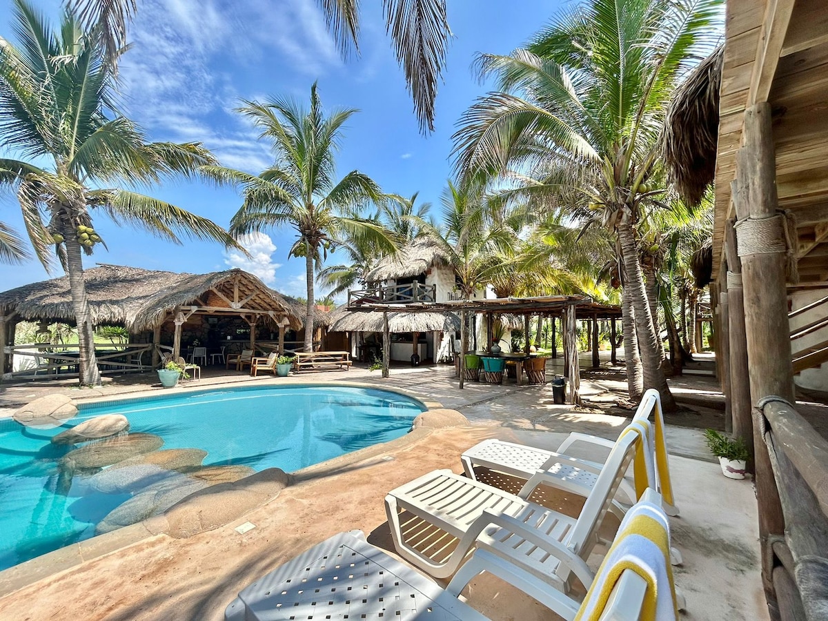Wir befinden uns mit Blick auf das Meer am Strand von Celestino Gazca, einem abgelegenen Ort mit frischen Meeresfrüchten, spektakulären Sonnenuntergängen und Nähe zur Natur. Der Strand ist ein Zufluchtsort für Meeresschildkröten, das einen verantwortungsvollen und nachhaltigen Tourismus zum Schutz der Umwelt fördert. Wir haben eine Palapa mit Hängematten, Bar, Gartenmöbeln und einem Pool mit Meerwasser - völlig natürlich, besser für die Gesundheit von Erwachsenen und Kindern.