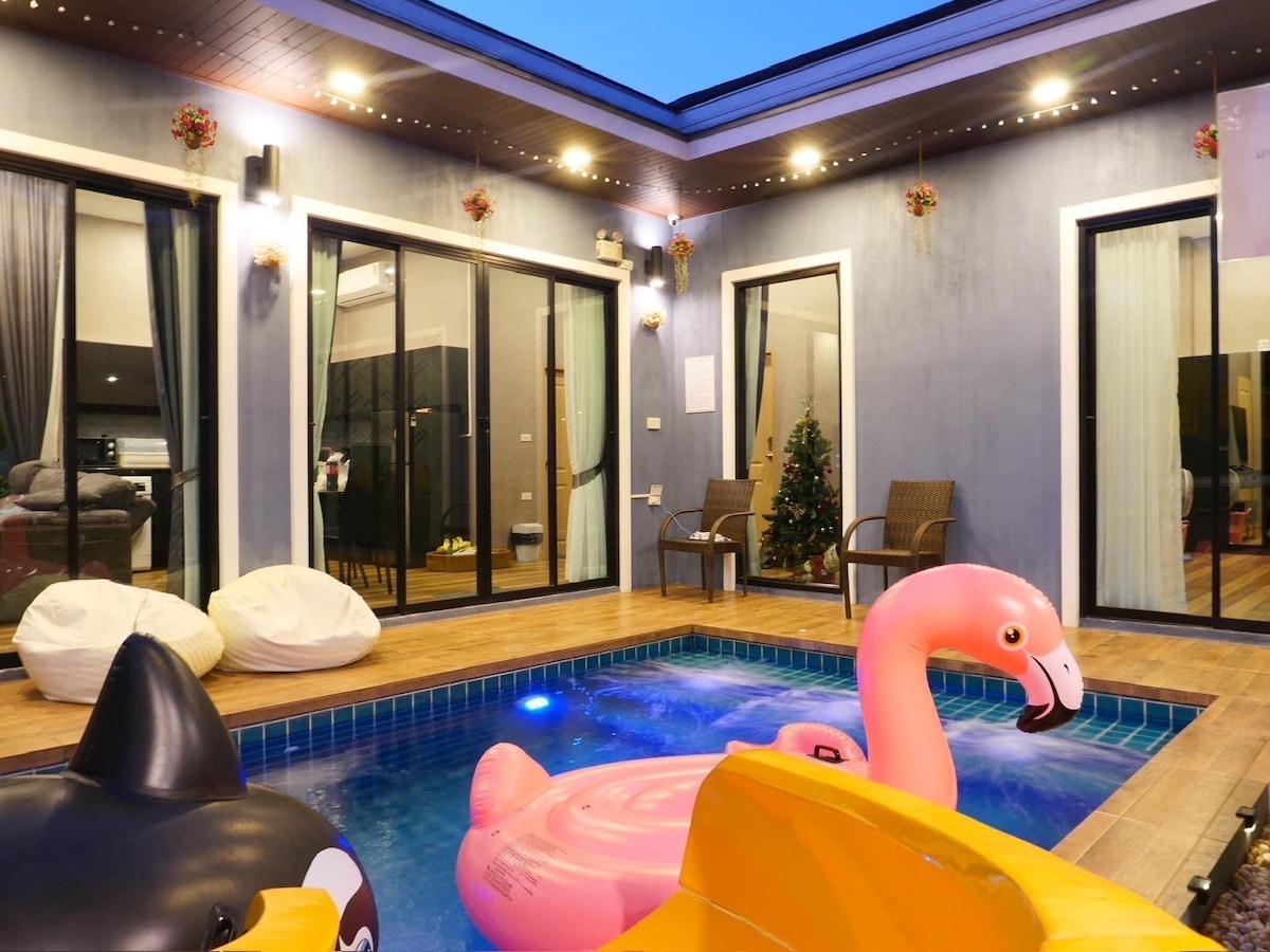Das Haus befindet sich in der Nähe der Stadt Hua Hin mit voller Ausstattung. Perfekt für Aktivitäten mit Familie und Freunden. * * * Angaben zur Unterkunft - Weniger als 10 Minuten zum Meer - In der Nähe von Restaurants, Cafés, Brauerei, Markt - Du kannst Lieferung, Service und Essen an deiner Tür bestellen. - Swimmingpool - Wasserspielzeug - Grosser Schieberegler - 7 Fuß großer Billardtisch - Karaoke - Smart-Fernseher Freies WLAN - Badetücher. - Warmwasserbereiter -Klimaanlage - Grill, Gasherd und Elektroherd - Langer Banktisch - Waschmaschine - Föhn - Ausblick auf die Gebirge