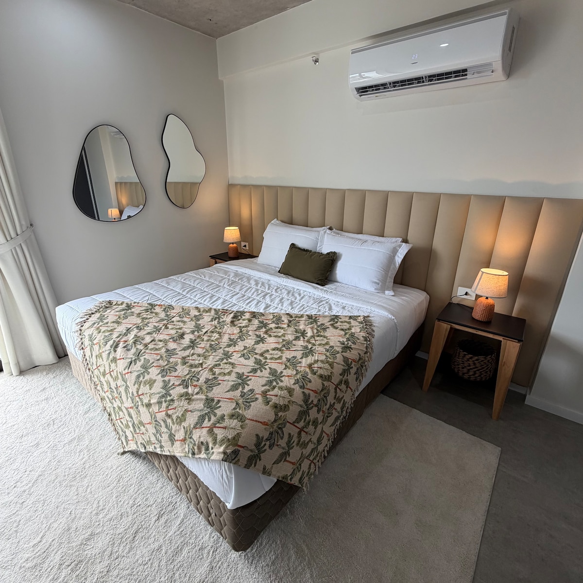 Departamento tipo loft, totalmente privado e independiente. Decoración sobria con excelente iluminacion y climatizado. Con escritorio para personas que vienen con fines laborales. Próximo al nuevo eje Corporativo y Comercial de Asuncion. Posee una amplia terraza con piscina, galeria con parrilla y gymnasio.