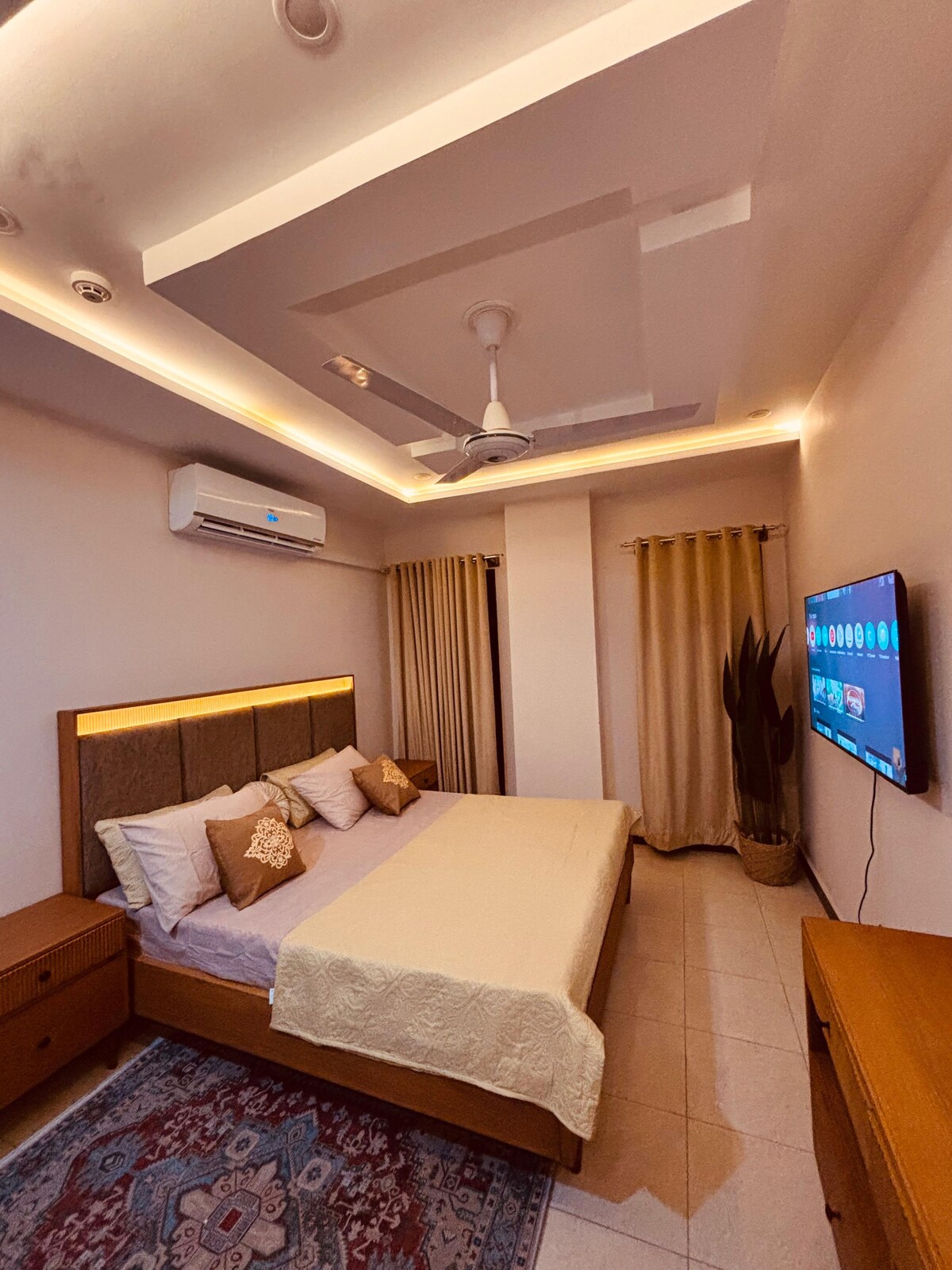 Welcome to your perfect home away from home! This stylish 2-bedroom apartment offers comfort, entertainment, and convenience ideal for families, couples, or business travelers. ✨ What you’ll love: Two spacious bedrooms One bedroom is designed as a private home cinema with a 110inch screen, perfect for movie nights 🎬 Attached bathroom for added privacy and comfort Bright and comfortable living hall, and a kitchen 🔑 Enjoy privacy, comfort, and a unique cinema experience—all under one roof.