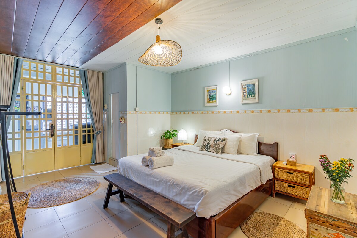 Soft light, green walls, and a touch of rattan. Welcome to your serene city hideaway. This thoughtfully designed room comes with a private bathroom and lush balcony, perfect for slow mornings or golden hour tea. Inspired by Khmer calm and natural textures, it’s your gentle pause in the heart of Phnom Penh. Located on Street 312, near Bassac Lane. While the home is tucked away from busy streets, you’ll still be within easy reach of cafes, the riverside, and transportation options.