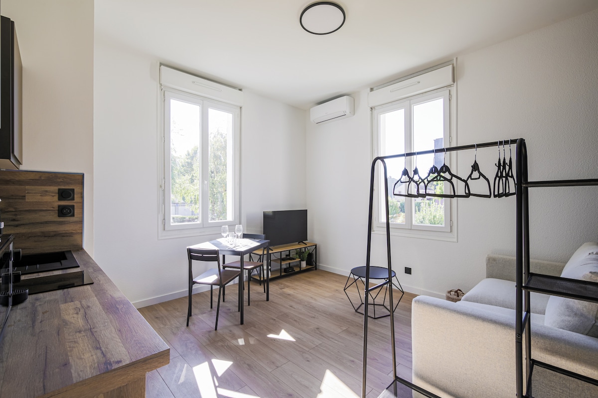 Geräumige und helle Wohnung mit Terrasse von 13 m2 in einer ruhigen Gegend mit Blick auf einen Park von 5 Hektar in der Nähe von Straßenbahn, Zentrum Rocheplane, Geschäfte, Bäckerei... Die Anreise erfolgt in der Regel ab 18:00 Uhr und die Abreise vor 12:00 Uhr. Schlafgelegenheit: 1 Doppelbett, 1 Schlafsofa für 1 Person Schneller Zugang zu den Skigebieten 40 Minuten (Chamrousse, Les 7 Laux, Alpe du Grand Serre) Möglichkeit der Ausleihe eines Kinderbettes Mindestmietdauer: 2 Nächte