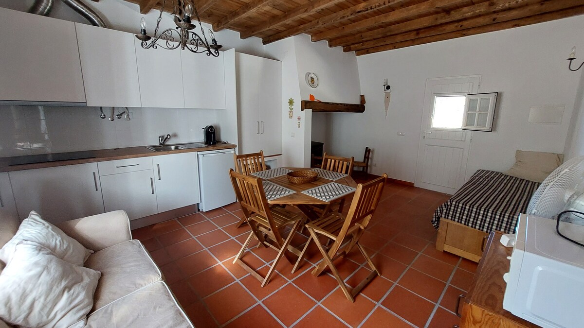Farmhouse in Ribatejo, 20km from Santarém, capital of Gothic. The guest house, with 60m2 and views of the orchard and garden, is designed for 3 or 4 people. It has a bedroom, living room with dining area and kitchenet, bathroom with shower. For larger groups, next to the guest house we have a private second bedroom/suite with 18m2, for 1 or 2 people, independent and wonderfully comfortable. Both spaces have AC, Smart Tv and wi-fi. The owner lives on the property.