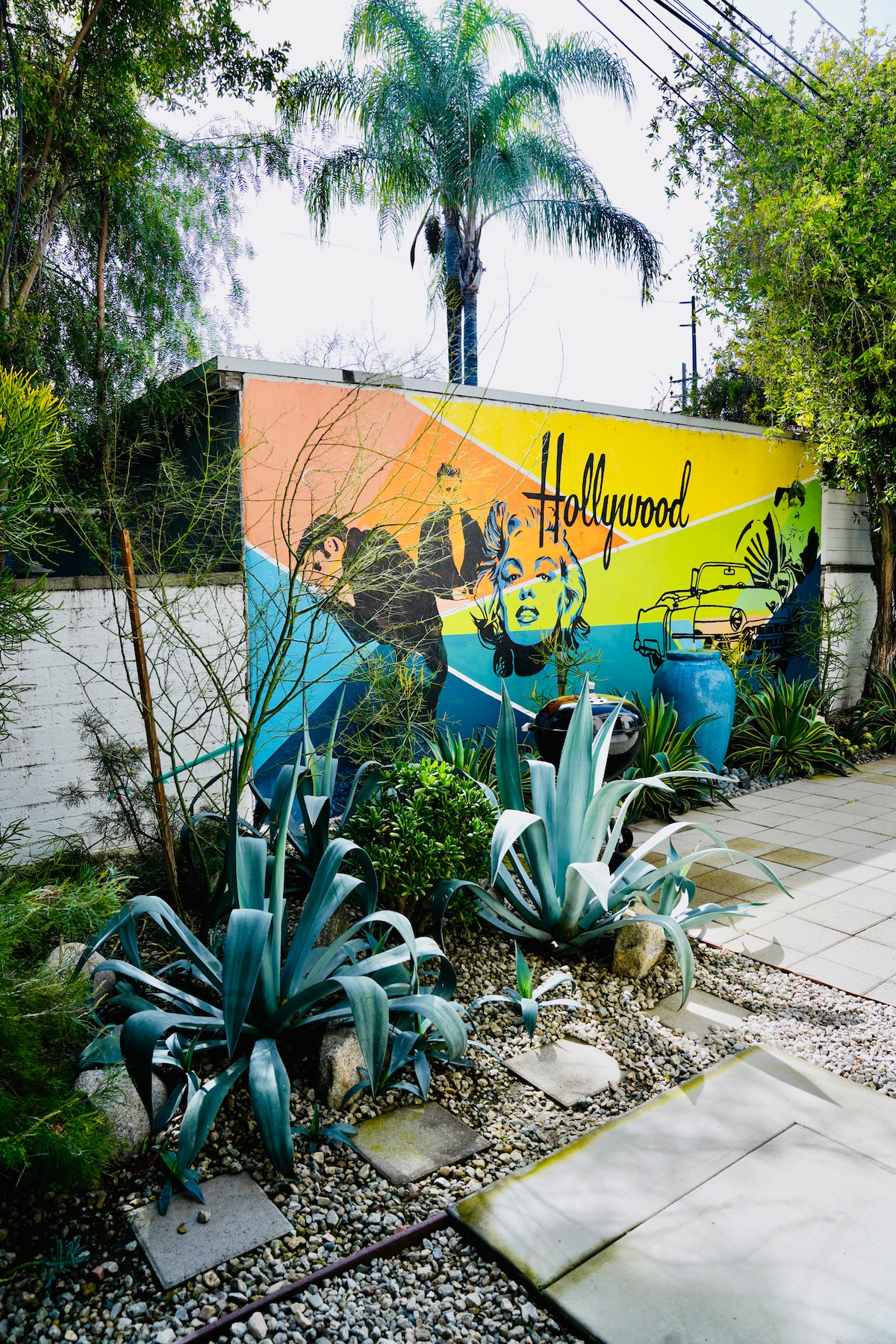 Wache mit Blick auf die Stadt auf und genieße die Sonne in einem klassischen spanischen Hollywood-Refugium mit böhmischem Flair. Frühstücke auf der Terrasse und blick über die Baumkronen, die sich in der kühlen Brise wiegen, bevor du eine Wanderung zum berühmten Hollywood-Schriftzug unternimmst. Eingezäunter, spanischer Charme in den Hollywood Hills, zwischen Beachwood Canyon und Hollywood Dell. Terrassen mit Aussicht und Wohnbereich im Freien/Terrasse mit mediterranen Gärten am Hang. Das Haus ist geteilt – der Gast wohnt im zweistöckigen Haupthaus, während die Gastgeber im hinteren Teil des Hauses mit separatem Eingang wohnen. Wir sind vielgereiste kreative Typen auf dem Gelände im geteilten Hinterhaus. Wir treffen dich bei deiner Ankunft und zeigen dir das Haus und den Hof und stehen dir dann per SMS oder Anruf für Fragen zur Verfügung. Wir freuen uns sehr, mit Gästen zu interagieren, respektieren aber auch, dass einige Gäste für sich bleiben möchten. Spaziere nach Hollywood, Beachwood Canyon oder Franklin Village. Uber oder Lyft kommen in Sekunden und bringen dich in wenigen Minuten nach Los Feliz, Silver Lake, Echo Park und West Hollywood. Griffith Park liegt nur wenige Minuten vom Haus entfernt. Gehe zu Fuß zur U-Bahn-Station Hollywood and Vine der Red Line. Der Flyaway-Bus von LAX bringt dich nach Hollywood und Argyle, nur 5 Blocks entfernt. Es kostet nur 8 Dollar. Uber und Lyft Autos sind überall. Nicht behindertengerecht – wir sind zwei Treppen im Freien hinauf, um das Haus zu betreten, und die Schlafzimmer sind eine weitere Treppe hinauf. Dieses Haus ist nicht kindersicher, daher nicht für Kinder geeignet, es gibt raumhohe Fenster ohne Kindersicherung. Wir haben einen schönen Doodle namens Theodore. Er ist hypoallergen und haart nicht. Er wird in einem separaten Hof gehalten und du wirst nicht mit ihm interagieren, es sei denn, du möchtest das natürlich!