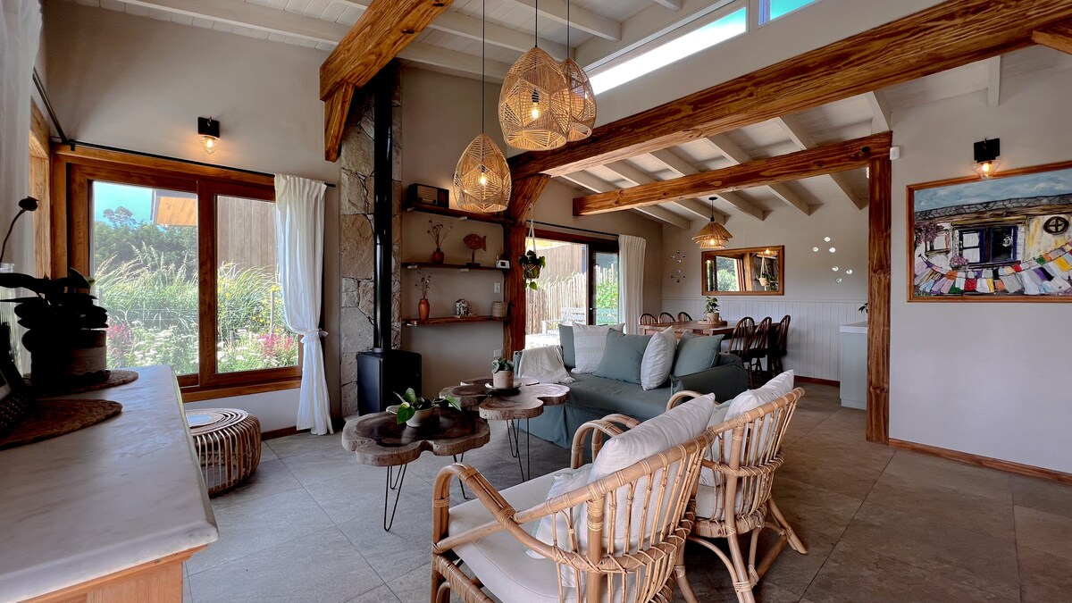 Casa Geo is a conscious home in a quiet area of Chapadmalal, with beautiful stream views and unique sunsets, just three blocks from Cruz del Sur and Paradise beaches. Built with natural materials and bioconstruction, it offers modern comfort, natural temperature regulation, a green roof and solar hot water. Ideal for disconnecting and enjoying nature at a slower pace.