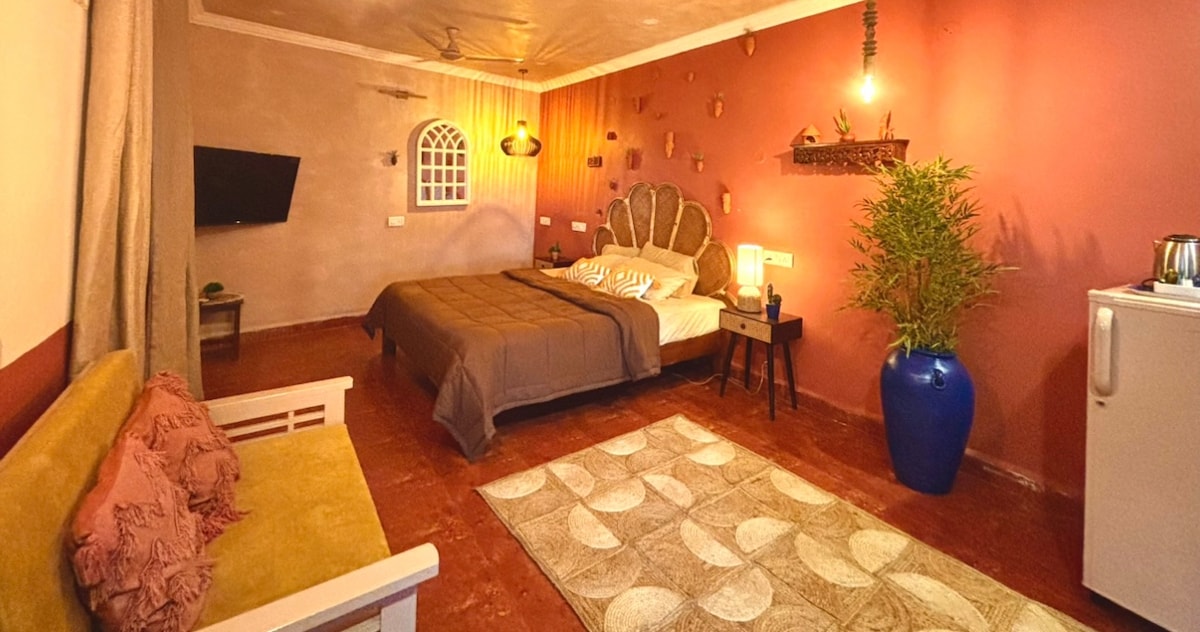 Our Signature Room is a design-forward space featuring a King bed, an open to sky bathroom, and a bathtub blending comfort with thoughtful aesthetics. The room is equipped with high-speed Wi-Fi, air conditioning, and a smart TV for a seamless stay. Located just 1.5 km from the beach and 900 meters from the local market, the property offers easy access while remaining a peaceful retreat. Our spaces are intentionally designed to foster community, creativity, and authentic travel experiences.