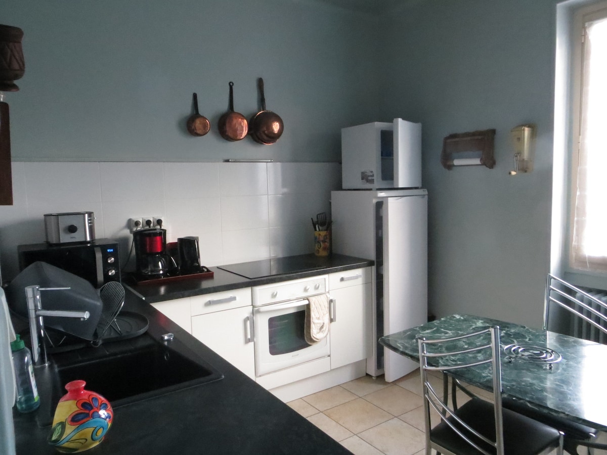 Visitez Lyon et dormir au vert ? C est possible. Logez dans notre appartement renové de 50m2 situé au 1er étage de notre domicile où nous logeons au rez de chaussée. Une chambre avec un lit de 180 ( possibilité de 2 lits de 90 sur demande), un salon avec TV ( canapé transformable en un vrai lit de 140), une cuisine équipée, une salle de bain avec douche et une terrasse de 10 M2 attenante, vue sur le parc arboré de 2000 m2 abondamment fleuri. piscine, barbecue, velo disponible Wifi gratuit