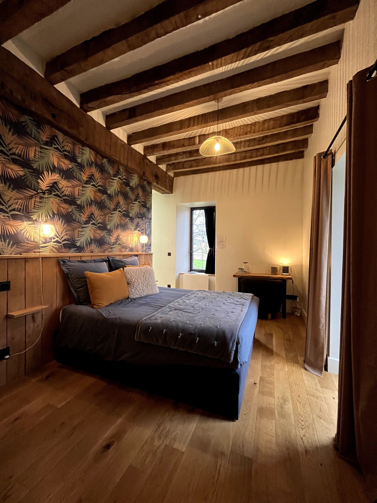 Nous vous accueillons dans notre maison en pierre au fond du jardin fleuri, dans la chambre bleue. Située à l'étage de notre maison en pierre, la chambre dispose d'un espace nuit avec un lit 2 places, un petit bureau, une salle d'eau privative avec une grande cabine de douche et WC. Pour votre confort nous fournissons le linge de lit, les gants. Le petit déjeuner fait maison. Servi au rez-de-chaussée dans la pièce de vie, il met à l’honneur des produits frais, bio et locaux.