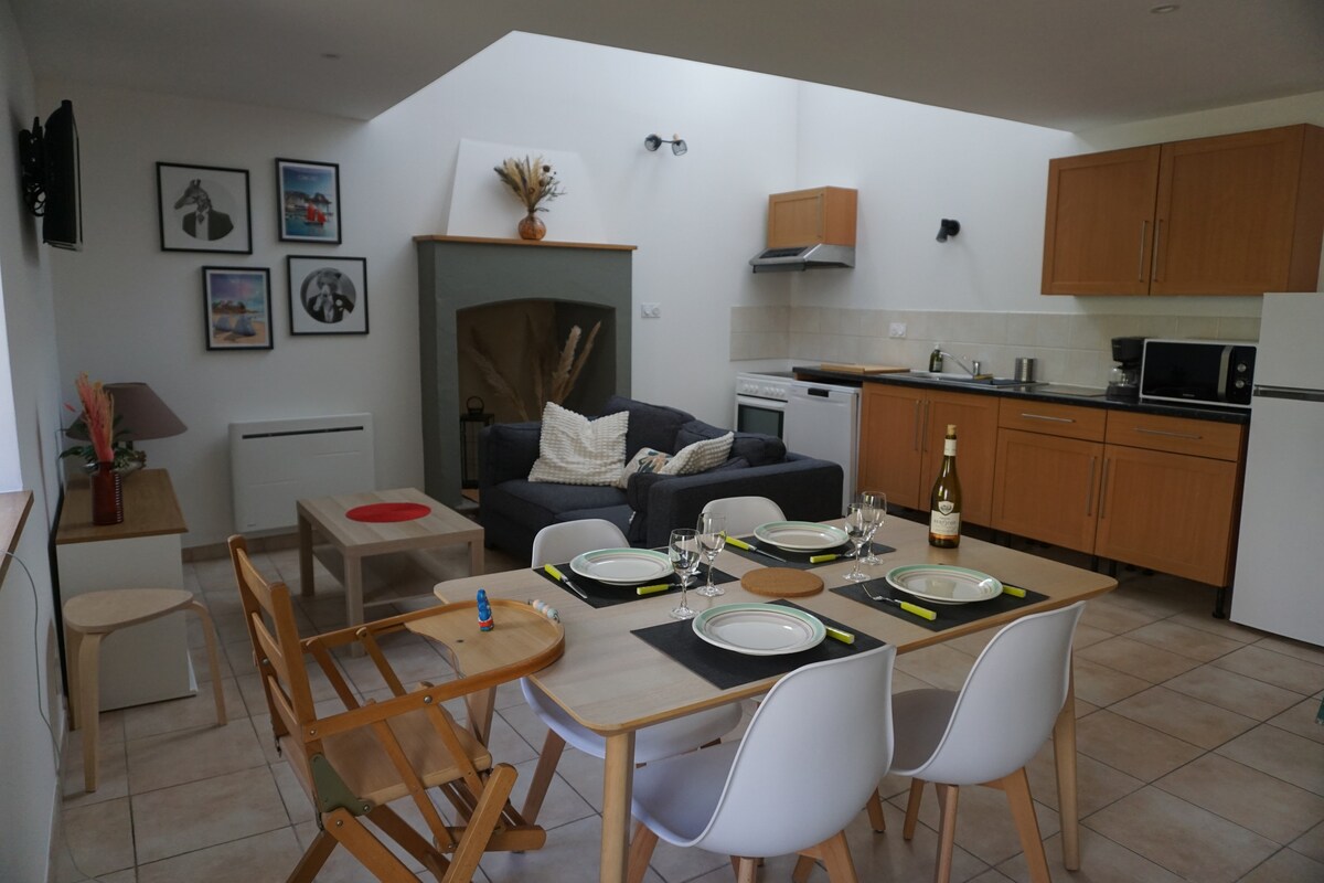 Maison neuve de plain-pied avec terrasse , jardin et une cour pour stationner La maison dispose d’une pièce de vie lumineuse , exposée plein sud avec salon/ séjour et cuisine équipée ouverte sur une terrasse. Le logement comprend 5 couchages, 2 chambres avec chacune un 1 lit de 160x200 , 1 canapé lit convertible avec un vrai matelas, 1 salle de douche avec WC. DRAPS ET SERVIETTES INCLUS Cellier avec machine à laver et sèche linge