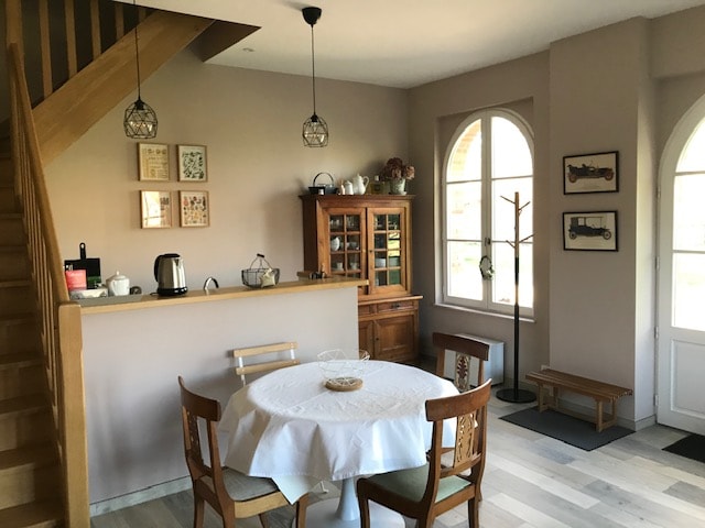 Schönes kleines Haus im Herzen eines charmanten, blumigen Dorfes, für 4 Personen. Dieses Nebengebäude eines ehemaligen Posthauses (Haupthaus der Eigentümer) besteht aus einem Wohn-/Esszimmer und einer ausgestatteten Küche. Es hat einen offenen und freien Blick auf einen großen Garten mit Bäumen (5500 m2). Im Obergeschoss: - 2 klimatisierte Schlafzimmer mit Doppelbetten (oder Möglichkeit von 2 Einzelbetten pro Zimmer) - 1 Badezimmer - 1 Badezimmer - 1 WC