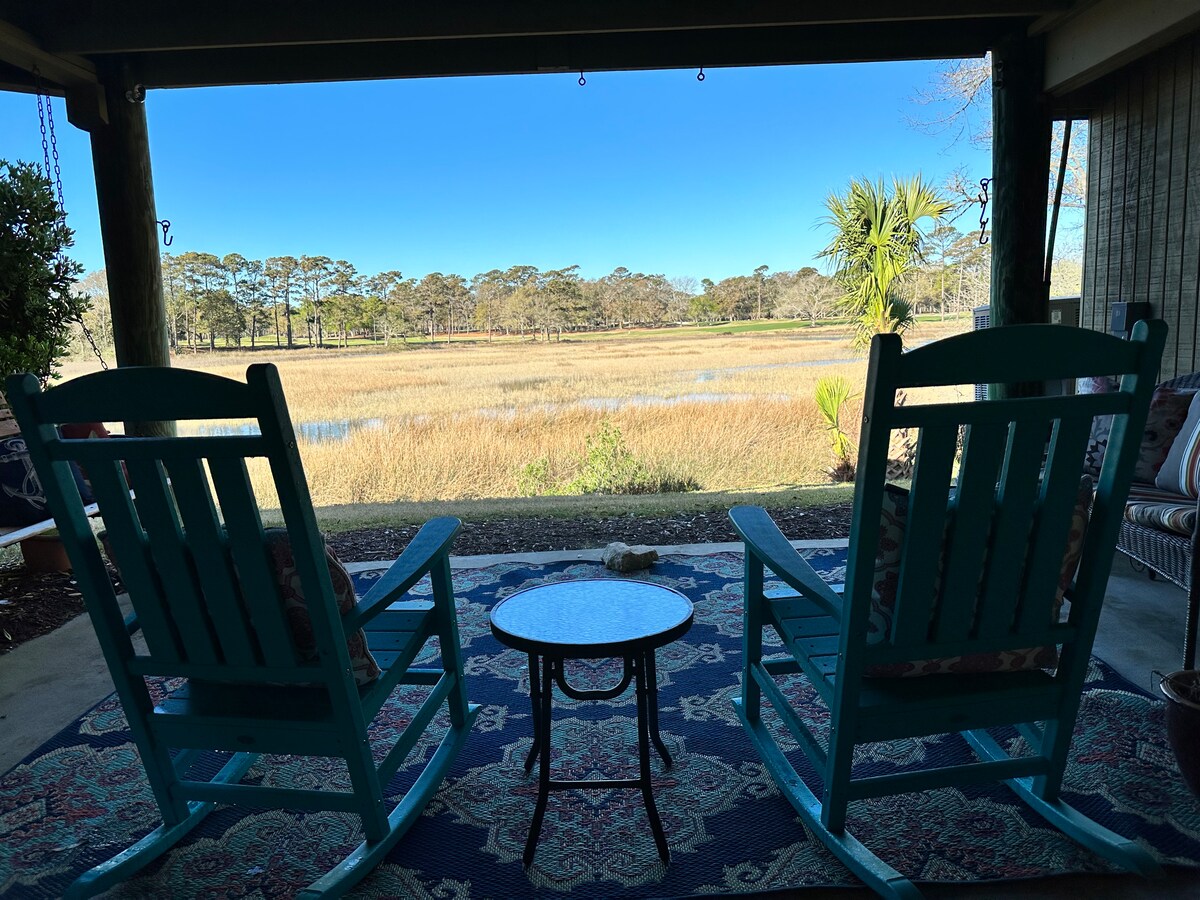 Genieße den schönen Meerblick direkt am Sumpf in der wunderschönen, einzigartigen A-Rahmen-Bauernhaus-Hütte in North Myrtle Beach, South Carolina. Genieße Kaffee und deine Lieblingsgetränke auf der hinteren Terrasse, während du den Sonnenaufgang über dem Atlantik beobachtest. Genieße die Ruhe und Gelassenheit der Natur, während du die Reiher vorbeifliegen siehst, lausche den Austern, wie sie beim Kommen und Gehen der Gezeiten zuklappen, und höre die Meereswellen. Häufige Sichtungen sind Weißkopfseeadler, Gimpel, Kolibris und mehr!