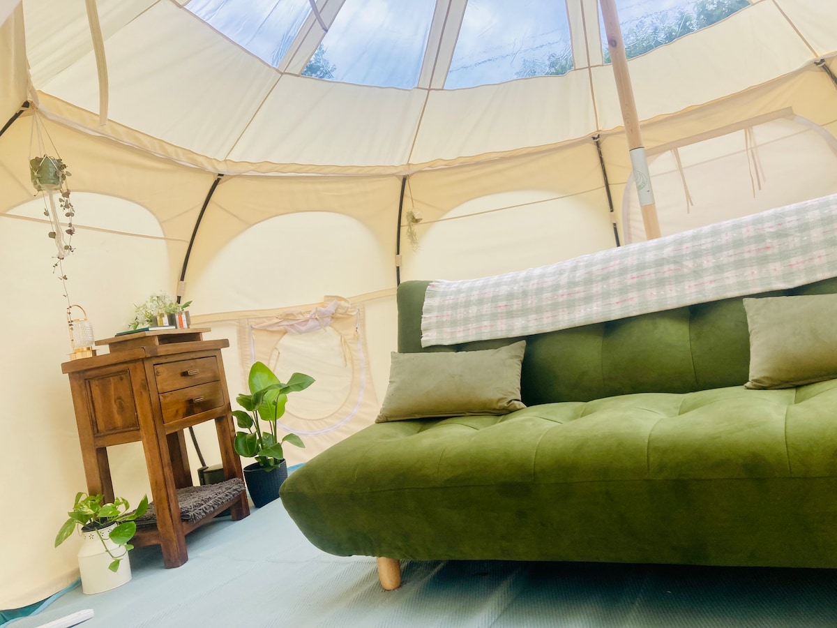 Entfliehe in die Natur, ohne auf Komfort in unserem wunderschön eingerichteten 5-Meter-Glockenzelt zu verzichten. Eingebettet in einen ruhigen Teil des Grundstücks, und mit unglaublicher Aussicht bietet dieses glänzende Erlebnis die perfekte Balance zwischen rustikalem Charme und modernen Annehmlichkeiten. Das Glockenzelt befindet sich auf einem Teil des South View Farm Pop-up-Campingplatzes Unser Glockenzelt verfügt über ein Doppelbett für 2 Personen, aber zusätzliche Gäste sind gegen einen kleinen Aufpreis willkommen. Wir stellen zwei bequeme Einzel-Campingbetten zur Verfügung. Gäste müssen nur ihre eigene Bettwäsche mitbringen.
