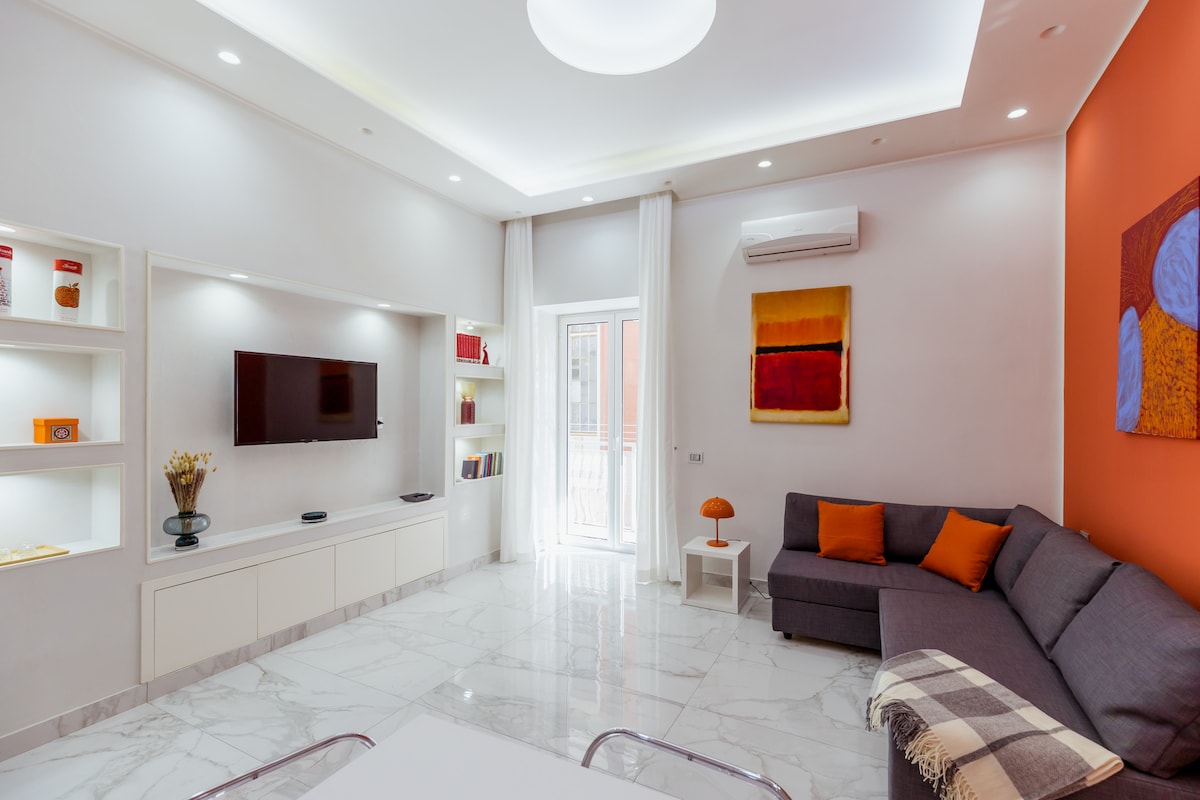 The apartment, just a 3-min walk from Amedeo Square (Metro L2, Funicular, Taxi Station), can host up to 5 guests and provides all the comforts for a relaxing stay in the heart of the elegant Chiaia district. The main spaces are: two cozy bedrooms with ensuite bathrooms, a spacious sitting room with a sofa bed, and a bright dining area with a handcrafted kitchenette. The interiors feature Liberty-style wood doors and frames from 1909, harmoniously balancing rustic elegance with modern amenities.