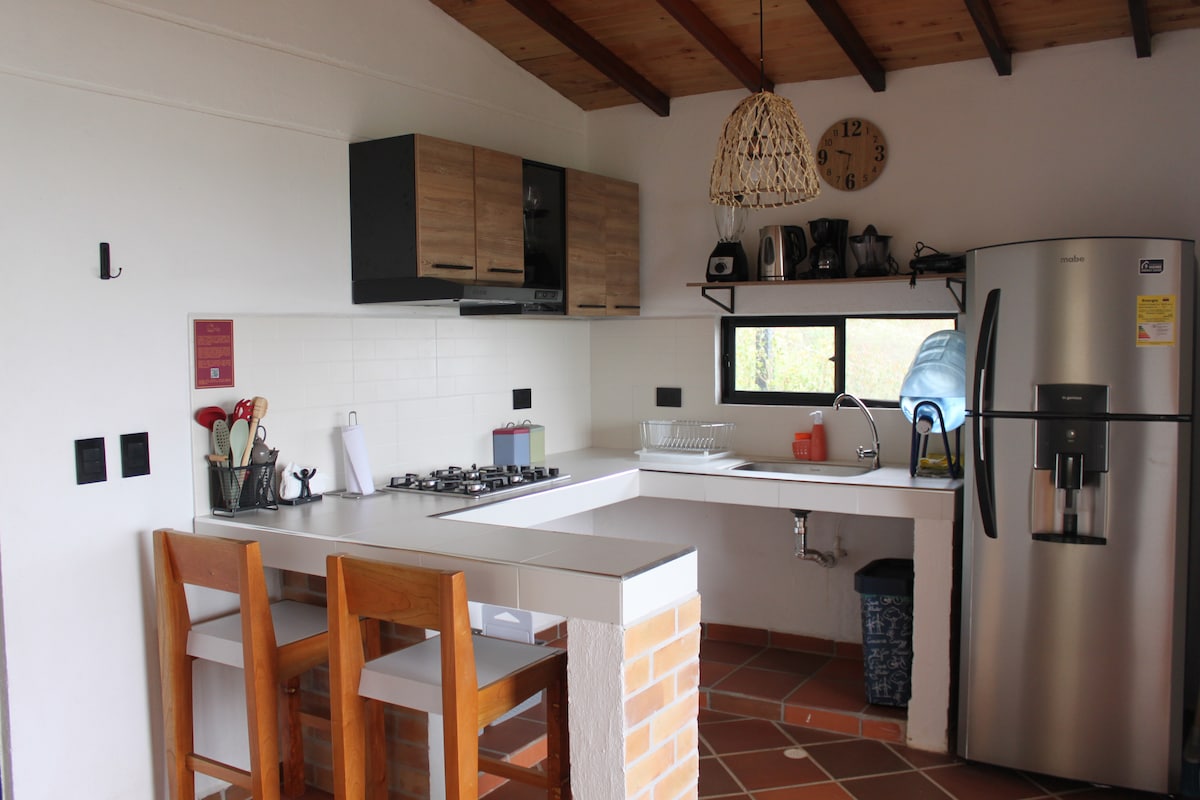 Casa de campo, está ubicada a 3.8 km del pueblo, vía a la vereda Arbolito. Fácil acceso, la carretera es destapada, se encuentra en buen estado y con gravilla. Disponibilidad para 5 personas y 2 adicionales. Contamos con filtros de agua para toda la casa, tanque de agua lluvia, Internet de alta velocidad Starlink. Se aceptan mascotas, menos las que deben usar bozal en lugares públicos, pero No las podrán dejar solas encerradas en casa si van a salir. Acá hay un perro llamado Carmelo.