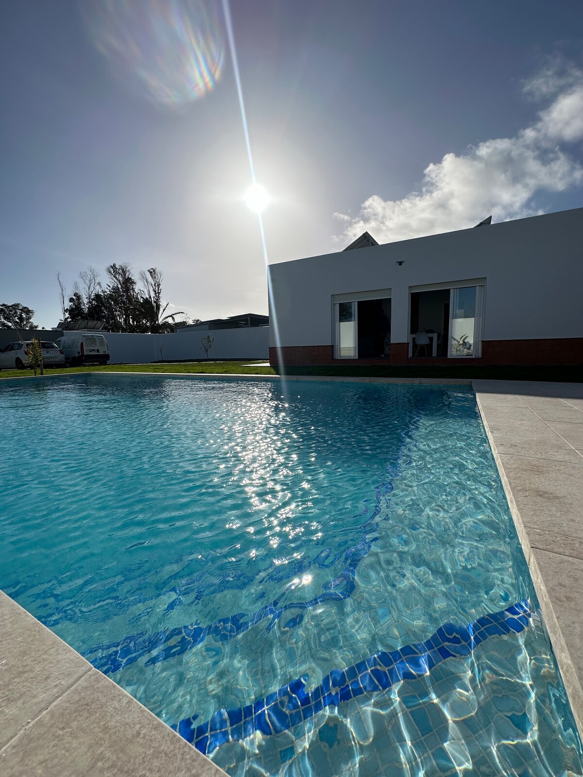 En este alojamiento se respira tranquilidad: ¡relájate con toda la familia! Chalet con piscina en buena zona de Chiclana, con supermercados cerca, fácil acceso y a 15 min. de la playa en coche. Tiene 3 dormitorios amueblados, aire acondicionado en el salón y WIFI gratuito. Se admiten mascotas domésticas. Patio techado de 80 m² con barbacoa, nevera, fregadero…con posibilidad de cerrarse totalmente mediante toldos verticales. Piscina de 8x4 totalmente vallada.